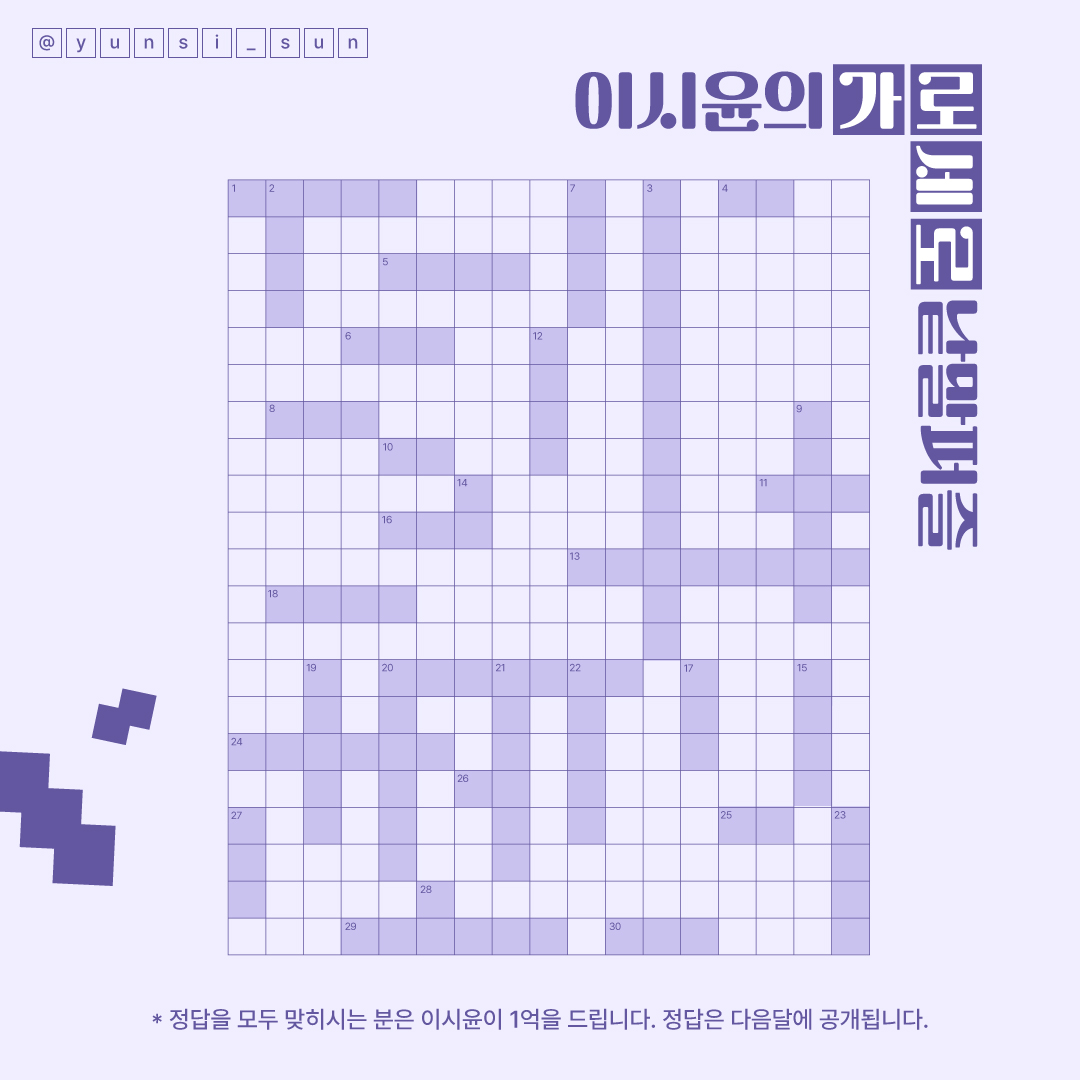 *정답을 모두 맞히시는 분은 이시윤이 1억을 드립니다. 정답은 다음 달에 공개됩니다. 가로질러 이시윤이 작년 처음으로 배운 겨울스포츠는?이시윤이 사계절 중 제일 좋아하는 계절은?이시윤이 제일 좋아하는 서울 다리는?걷는 것보다 밤에 멀리서 보는 걸 좋아한다.이시윤이 가장 좋아하는 교통수단은?이시윤이 앞으로 하고 싶은 타투모양은?이시윤이 다른건 다 끊어도 이것만큼은 끊을 수 없는 것은?이시윤이 올해부터 실천하기로 굳게 다짐한 일은?이시윤이 가지고 있는 유일한 알레르기는?이시윤 고향 친구 별명은?이시윤의 채식 인스타 계정은? (채식 친구들 모여라~!)이시윤이 틈만 나면 힐링하러 가는 미술관은?(서울 강서구 마곡중앙8로 32)이시윤이 처음 투입된 시사교양 프로그램 첫방송 날짜는?<OOO 37회차 많은 시청 부탁드립니다>이시윤이 작년 처음으로 배운 여름스포츠는?이시윤에게 산 vs 바다이시윤의 폰 배경화면은?이시윤이 서울에서 강서구 다음으로 제일 좋아하는 구는? 아래로 이시윤이 생각하는 강서구 별명은?이시윤이 들어간 시사교양 프로그램명은?( the story of the day when the tail was bitten )이시윤의 최근 바뀐 MBTI는?이시윤이 제일 좋아하는 여성 감독 이름은?이시윤이 석양을 바라보며 테라스에서 비건음식을 즐겨 먹는 마곡 식당은?이시윤의 먼저 떠난 강아지 이름은?이시윤이 제일로 좋아하는 초밥집 이름은?(서울 강서구 공항대로 51길 17-7 1층)이시윤이 죽기 전에 꼭 다시 갈 것 이라고 마음 먹은 해외 도시는?(Hint : 포르투갈의 작은 도시)이시윤을 최근 펑펑 울게 만든 책은?이시윤이 요새 즐겨보는 넷플릭스 애니는?이시윤이 시간적 여유만 된다면 당장 하고 싶은 것은?(도움 없이 혼자 물속에서 숨을 쉴 수 있게 해주는 장비를 착용하고 하는 다이빙)이시윤이 이번 지방선거때 가서 투표한 곳이자틈만 나면 힐링하러 가는 식물원 풀네임은? (서울 강서구 마곡동로 161)이시윤이 최근 3개월동안 가장 많이 들은 노래는?이시윤의 프로필 뮤직은? (선우정아 서울체크인 OST Part 6)이시윤의 영어 이름이자 프랑스 이름은?