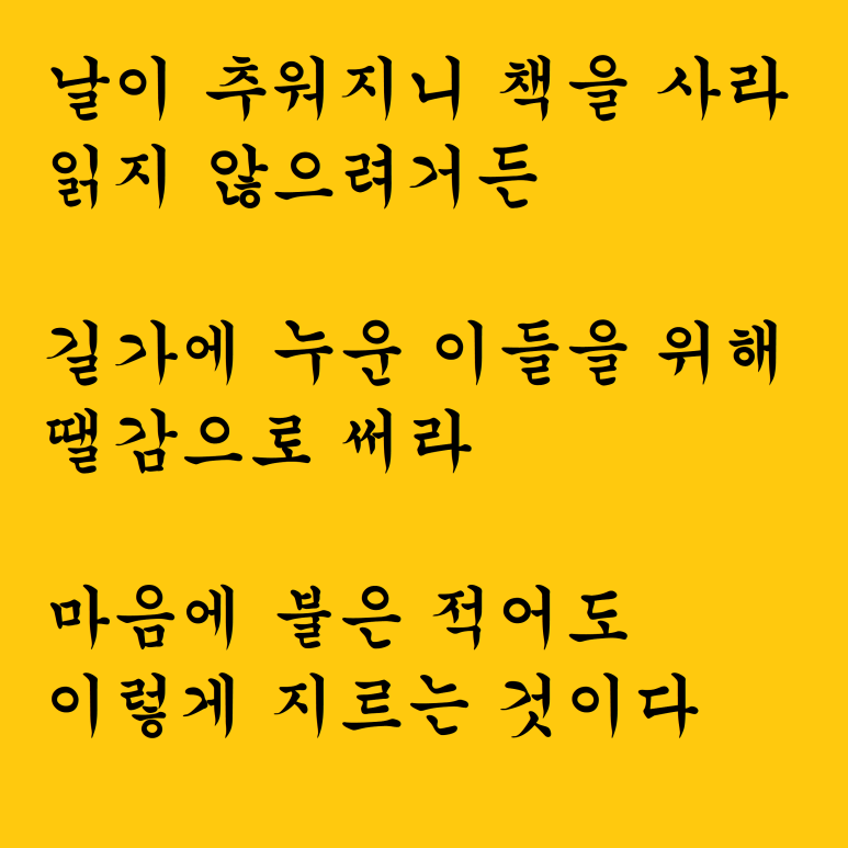 날이 추워지니 책을 사라읽지 않으려거든길가에 누운 이들을 위해땔감으로 써라마음에 불은 적어도이렇게 지르는 것이다-제 졸시를 모은 [I`M NOT A FANCY. NO, I`M NOT.]에 실었던 시입니다. 궁서체로 썼습니다. 저 진지합니다.내일은 호랑이가 장가간다는 동지(冬至)입니다. 서울 아침 온도는 최저 -9도라고 합니다.충남권과 전라권, 제주도는 눈이 오고 강한 한파가 지속된다고 하니 동파 조심하시고 건강도 유의하셔요.너무 추우시면 다시서점으로 오셔서 마음에 불을 지르십시오.다시서점,내일 뵙겠습니다.