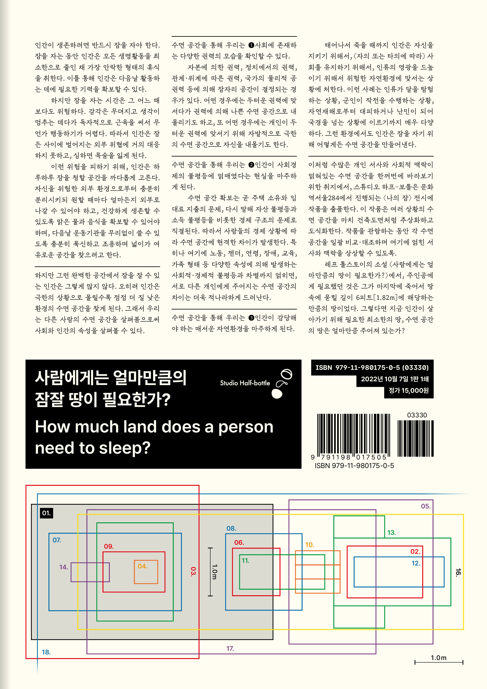 사람에게는 얼마만큼의 잠잘 땅이 필요한가? / 조현익(스튜디오 하프-보틀)레프 톨스토이 소설 〈사람에게는 얼마만큼의 땅이 필요한가?〉에서 주인공이 마지막으로 필요로 했던 땅은 그가 죽어서 묻힐 6피트[1.82m]였다. 스튜디오 하프-보틀은 수면 공간에 주목하고 지금 인간이 살아가기 위해 최소한으로 필요한 땅에 관하여 고민했다. 완벽한 공간에 잠을 잘 수 있는 인간은 별로 없고 오히려 극한으로 몰리는 현실. 감옥과 단식농성장, 공중화장실과 비닐하우스, 달 착륙선이나 대피소 텐트 등. 중철 제본으로 제작된 이 책은 수면 공간을 한데 모아 살펴보며 공간에 얽힌 수많은 개인 서사와 사회적 맥락을 소개한다. 책장을 넘기다 보니 톨스토이 소설 ‘사람은 무엇으로 사는가’에 담긴 “사람의 마음속에는 사랑이 있다.”라는 구절이 떠오른다. ‘사람에게는 얼마만큼의 잠잘 땅이 필요한가?’라는 말은 ‘사람에게는 얼마만큼의 사랑이 필요한가?’일지도 모른다는 생각도 든다. 이토록 추운 날, 마음속 사랑이 밖으로 뻗어나가기를 빈다.김경현다시서점 운영자-학교도서관저널 2022년 12월호에 소개한 책입니다.#사람에게는얼마만큼의잠잘땅이필요한가 #스튜디오하프보틀 #다시서점구매하기https://smartstore.naver.com/dasibookshop/products/7466220457