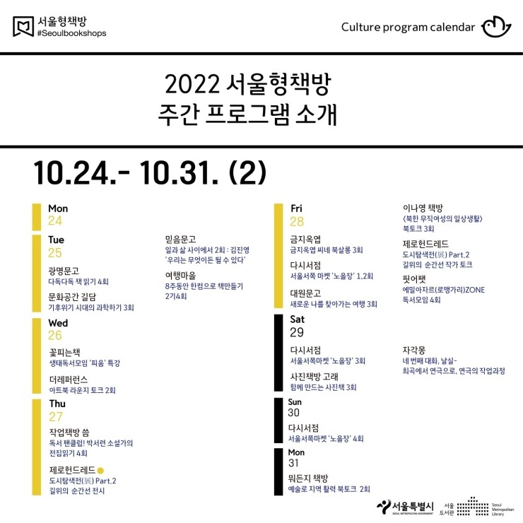 💌 #2022서울형책방 ◆ 10.24.-10.31. 주간 프로그램 소개 (2) ◆ 10. 25.(화) - 광명문고 <다독다독 책 읽기 4회>10. 25.(화) - 문화공간 길담 < 기후위기 시대의 과학하기 3회>10. 25.(화) - 믿음문고 <일과 삶 사이에서 : 김진영 우리는 무엇이든 될 수 있다 2회>10. 25.(화) - 여행마을 <8주동안 한컴으로 책만들기 2기4회>10. 26.(수) - 꽃피는책 <생태독서모임 : 피움 특강>10. 26.(수) - 더레퍼런스 <아트북라운지 토크 2회>10. 27.(목) - 작업책방 씀 <독서 팬클럽! 박서련 소설가의 전집 읽기 4회>10. 27.(목) - 제로헌드레드 <도시탐색전(展) - part2. 길위의 순간선 전시>10. 28.(금) - 금지옥엽 <금지옥엽 씨네 북 살롱 3회>10. 28.(금) - 다시서점 <서울서쪽마켓 '노을장' 1,2회>10. 28.(금) - 대원문고 <새로운 나를 찾아가는 여행 3회>10. 28.(금) - 이나영 책방 <북한 무직여성의 일상생활 3회>10. 28.(금) - 제로헌드레드 <도시탐색전(展) - part2.길위의 순간선 작가토크 2회>10. 28.(금) - 핏어팻 <에밀아자르(로맹가리) ZONE 독서모임 4회>10. 29.(토) - 다시서점 <서울서쪽마켓 '노을장' 3회>10. 29.(토) - 사진책방 고래 <함께 만드는 사진책 3회>10. 29.(토) - 자각몽 <네 번째 대화: 날실―희곡에서 연극으로, 연극의 작업과정 4회>10. 30.(일) - 다시서점 <서울서쪽마켓 '노을장' 4회>10. 31.(월) - 뭐든지 책방 <예술로 지역활력 북토크 2회> ※ 프로그램 신청 및 상세 프로그램 내용은 각 서점 인스타그램에서 확인해주세요.※ 프로그램은 운영 상황에 따라 변경될 수 있습니다.