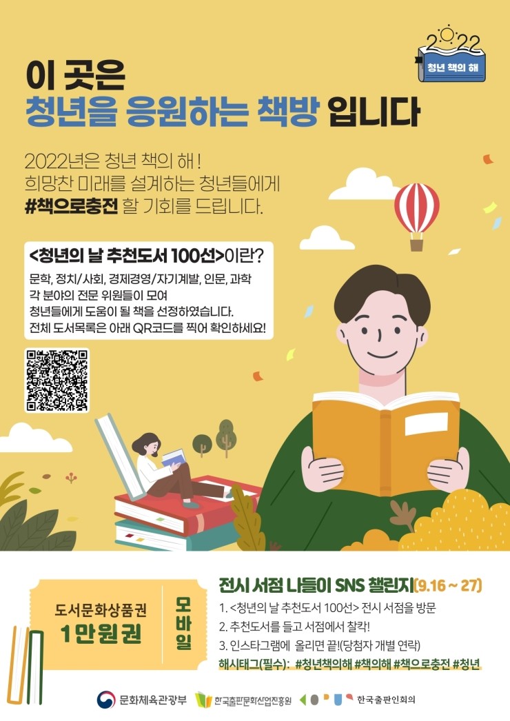 다시서점에서 <청년의 날 추천도서 100선> 전시를 시작합니다. 정치/사회 분야 20권의 책이 전시되어 있습니다. SNS에 참여하시고 도서문화상품권도 받아보세요. :) - 2022년은 청년 책의 해!희망찬 미래를 설계하는 청년들에게#책으로충전 할 기회를 드립니다. <청년의 날 추천도서 100선>이란?문학, 정치/사회, 경제경영/자기계발, 인문, 과학 각 분야의 전문 위원들이 모여 청년들에게 도움이 될 책을 선정하였습니다.전체 도서목록은 QR코드를 찍어 확인하세요! - 전시 서점 나들이 SNS 챌린지(9.16~27) 1. <청년의 날 추천도서 100선> 전시 서점을 방문2. 추천도서를 들고 서점에서 찰칵!3. 인스타그램에 올리면 끝! (당첨자 개별 연락)해시태그(필수) #청년책의해 #책의해 #책으로충전 #청년