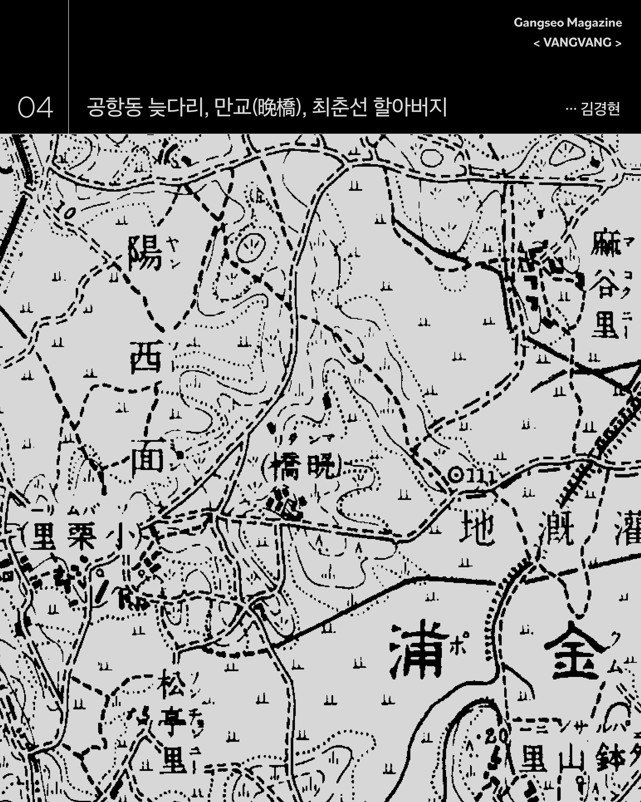 공항동 늦다리, 만교(晩橋), 최춘선 할아버지1919년 지도를 보다 보니 ‘만교’(晩橋)라는 곳이 나옵니다. 동네 어른들과 대화를 나누다 보면 종종 옛 지명을 들을 때가 있는데 '만교'는 처음 보았습니다. 대부분 논이었다 보니 저 부근(좌측 지도)에 사람들이 모여 살던 곳을 만교라고 부른 듯합니다.2011년 YTN 라디오에 공항동 동네 이름이 소개되었는데 한국땅이름학회 배우리 회장의 말에 따르면 '늦다리(만교)'는 '고려 때 수원으로 통하는 국도를 닦을 때, 이곳에 놓은 돌다리 공사가 늦게 이루어졌다 하여 생긴 이름'이라고 합니다. (이 근처를 돌아다녀도 돌다리 흔적은 찾을 수 없습니다.)2009년 2월 13일 서울역사편찬원이 펴낸 <서울지명사전>에서 늦다리는 '강서구 공항동에 있던 마을로서, 눌언마을의 눌언방죽에는 고려 때 수원과 송도로 통하던 다리가 있었는데 이 다리를 만들 때 공사에 어려움이 있어 준공이 매우 늦게 된 데서 마을 이름이 유래되었다. 만교 · 만교동이라고도 하였다.'라고 합니다.서울지명사전은 온라인으로도 잘 정리되어 있는데 '늦다리'와 관련한 지명은 총 7건이 검색됩니다.공세논골짜구니강서구 공항동 늦다리 근처에 있던 골짜기이다.누랭이방죽다리강서구 공항동에 있던 다리이다. 누랭이방죽에 있는 작은 돌다리에 붙여진 이름이다. 누랭이방죽다리라고도 하였으며, 옛날 송도와 수원 사이 국도에 있던 다리로 준공이 늦어져 늦다리, 한자명으로 晩橋라고 하였다. 1966년 발간된 ≪한국지명총람≫에 기록되어 있으나 지금은 없다.늦다리강서구 공항동에 있던 마을로서, 눌언마을의 눌언방죽에는 고려 때 수원과 송도로 통하던 다리가 있었는데 이 다리를 만들 때 공사에 어려움이 있어 준공이 매우 늦게 된 데서 마을 이름이 유래되었다. 만교・만교동이라고도 하였다.늦다리길늦다리길은 이 길이 지나는 마을 앞에 위치한 다리인 늦다리에서 유래되었다. 늦다리는 강서구 방화제1동 609-167번지(공항로)에서 공항중학교를 지나 공항동 7-1번지에 이르는 폭 10m, 길이 750m의 2차선 도로이다. 이 길은 1997년 5월 6일 처음 늦다리길로 이름 붙여졌다.뒤너머골강서구 공항동에 있던 마을로서, 늦다리마을의 뒤쪽 너머에 있던 데서 마을 이름이 유래되었다. 뒤너머골이라고도 하였다.뒤너미강서구 공항동에 있던 마을로서, 늦다리마을의 뒤쪽 너머에 있던 데서 마을 이름이 유래되었다. 뒤너머골이라고도 하였다.자개방죽논강서구 공항동 늦다리 근처의 들에 있던 논으로서, 자가사리가 끼는 논이었다고 한다.한국항공협회에서 펴낸 <2020 항공진흥>에는 특별기고로 <김포공항 지역 땅이름과 공항 지형 입지조건 연구(김영천)>이 실려있는데 '늦다리'를 다르게 해석합니다.늦다리[마을]고려 때 수원으로 통하는 국도를 닦을 때 이곳에 놓은 돌다리 공사가 ‘늦게 이루어졌다’ 하여 생긴 이름이라 한다. 그러나 ‘늘어졌다’ 뜻의 ‘느러’라는 말이 ‘느러>늘>늦(晩)’으로 변하였고, 들판의 ‘들’이란 말이 ‘들>달>다리(橋)’로 변한 것이 합쳐져서 ‘늘어진 들판 위에 형성된 마을’ 이란 뜻의 ‘늦다리’ 땅이름으로 굳혀졌다가 한자로 ‘만교’(晩橋)로 된 것이다.시간이 지남에 따라 '만교'라는 지명이 이동하는 것을 확인할 수 있습니다. 현재는 공항초등학교 앞이라고 나옵니다. 1919년 지도에서 송정초등학교 뒤편으로 나왔던 것이 꽤 멀어졌습니다.그리고 '만교'를 검색하다 보면 최춘선 할아버지가 나옵니다.만교 최춘선(1921 ~ 2001. 09. 08 향년 80세)은 대한민국의 독립유공자이며 목사다. "맨발 할아버지"로 불린다. 부친은 부농이었다. 넉넉한 가정형편을 바탕으로 와세다 대학교를 졸업하였으며 5개 국어를 할 수 있었다. 가가와 도요히코와 우치무라 간조로부터 영향을 받았으며 일제강점기에는 일본군 징용을 거부하고 만주로 가서 광복군 섭외부장 등 임시정부 광복군 간부로 활동했다. 독립유공자에 지정되었으나 모든 혜택을 거부했다. 광복 후 신학교에서 교육받아 목사가 되었다. 안수는 한국 그리스도 교회에서 받았으며, 1949년 김포 그리스도 교회 목사로 시무했다. 이후 한남동 번듯한 주택에 살았고, 김포공항으로 들어가는 큰길에서 인천 국도까지 수십만 평에 달하는 상속재산을 실향민, 빈민들에게 기부했고, 남은 땅 3,000평은 사기당했으나 고아를 돌보는 등 선행을 멈추지 않았다. 70년대 초 목회를 접고 문서선교와 노방전도에만 전념했다. 통일할 때까지 맨발로 걷겠다고 선언하여 죽을 때까지 신발을 신지 않았다. 지하철에서 전도하던 도중 앉은 채로 소천하여 만화와도 같은 종지부를 맺었다.교회 관련 자료에서도 이름이 보이곤 합니다.1957년 7월 11일(목) 오후에는 김은석이 경기도 김포군 양서면 송정리 만교 최춘선의 자택에 도착하여 저녁에 김포 그리스도의 교회에서 스가랴 7-8장을 봉독하였다.1957년 7월 11일 오후에 김은석 목사가 경기도 김포군 양서면 송정리 만교 최춘선 전도자 자택에 도착하였으며, 저녁에 김포 그리스도인 집회소에서 말씀을 선포하였다. 김포 그리스도의 교회는 최춘선 전도자가 세우고 섬겼던 교회였을 것이 확실하다.1957년 7월 11일 아침에