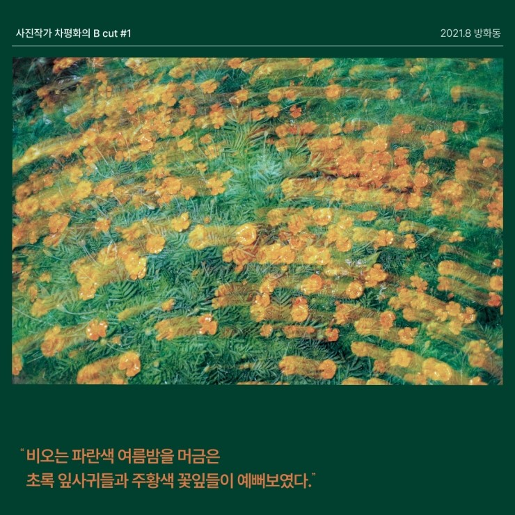 차평화@filmofpeace 차평화의 B cut #1"비오는 파란색 여름밤을 머금은 초록 잎사귀들과 주황색 꽃잎들이 예뻐보였다."