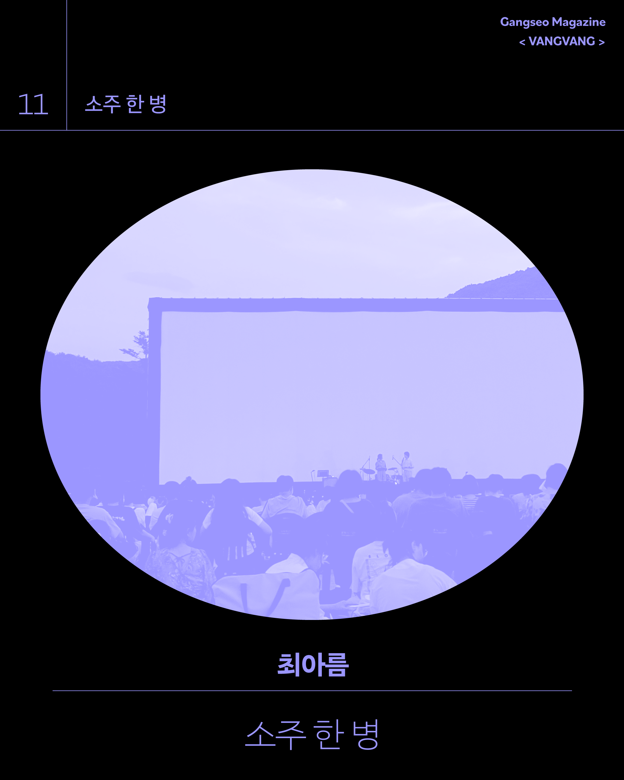 소주 한 병 #1. 커피와 물병, 소주병이 있는 테이블. 아름과 A. 첫 번째 잔을 주고받는다. A: 여기 오랜만이다.아름: 그러게, 여전하다. 그리웠어. 된장찌개, 커피.A: 아직도 그때 극장 가?아름: 어디? 스폰지하우스? 중앙극장? 선재? 다 없어졌지. 옛날 일이야. 주말마다 참 열심히 다녔어. 영화 보러 나가면 엄마가 "영화 못 보고 죽은 귀신 씌었냐"고 매번! 꼭! 말했는데. 지금은 영화도 잘 안 봐. OTT 본다, 야 ㅎㅎ사장님이 테이블 위에 된장찌개와 버터간장계란밥, 반찬 몇 가지를 내려둔다.아름: 아, 가끔 영화 좋아하는 사람들끼리 "무인도에 영화 3편 가져갈 수 있다면?"이란 질문 하잖아. 그때 얘기하는 영화들 다 그 극장에서 봤는데. (소주를 마시며 살짝 웃는다.) 지금 내 취향 지분의 대부분은 그 극장 때문? 덕분이지. 뭐 나도 극장에 잘 안 가면서 없어졌다고 툴툴거리는 것도 웃기긴 하다.테이블 유리 아래 언제부터 쌓여 있었을지 모를 입장권, 외화, 영화표, 사진 등을 지나 가게 곳곳을 바라본다. 시선의 끝에 CD가 잔뜩 장식된 오디오 옆 꽃다발이 있다.아름: 그땐 극장에 있는 시간표 종이 챙겨 다니면서 무슨 내용인지도 모르고 봤는데. 좋으면, 어려워서 다시 본 게 많지만 어쨌든, 또 보고, 한참 장면 장면 생각하면서 주인공에게 편지도 쓰고, 악역 때문에 화도 내고, 버스에서 가끔 울기도 했다? 고민, 공상이 많은 시기였거든. 한참 아주 먼 미래의 일로 우울해하고 걱정하는. 영화 속에 막 나처럼 고민하고 우는 사람이 있는데, 그 사람은 소리 지르고, 훌쩍 떠나기도 하고, 뭘 막 부수고, 법도 어기고 난 절대 못 할 것 같은 기행들을 하는 걸 보면서 만족이 되는 거지? 만족감 속에서 난 저러면 안 되겠다 생각도 하고. 덕분에 안전한 20대를 보냈다고 해야 하나. 답을 얻었던 건 아니었어. 그냥 극장에선. 영화를 보면서. 마음껏 고민할 수 있었나 봐. 안전하다고 느꼈고, 그랬던 것 같아. 그곳이 없어져서 그래서 쓸쓸했나 봐.아름과 A, 남은 술잔을 비운다. #2. 오래된 호프집. 비어있는 생맥주잔과 안주 그릇이 보인다. 아름과 B. 두 번째 소주잔을 주고받는다. B: 아니. 여기 포차 골목 싹 없어졌더라, 완전 우리 아지트였는데. 주방장 모자 쓴 사장님 아직도 기억난다.아름: 기억 안 나? 낮술 하러 왔다가 그 앞에서 사장님들 투쟁하는 거 보고 엄청 속상해했잖아. 안 없어질 줄 알았는데..B: 거기 다른 사람들이랑도 많이 갔는데, 아쉽네..북적북적한 종로의 포장마차 골목, 플라스틱 의자와 테이블, 쉴 새 없이 이야기를 나누는 사람들의 모습을 비춘다. 아름: (소주를 마시며) 그 사장님 덕분에 나 이제 굴도 먹잖아! 사람 좋은 미소로 서비스라고 주시는데 못 먹어도 먹어야지 ㅎㅎ 더워도 추워도 다 참고 먹고 마시고 떠들었어. 요즘은 그때처럼 마냥 좋아하는 공간이 없어. 조금 정 붙는다 싶으면 없어지니까. 내가 좋아하면 자꾸 없어져. 내 취향이 이상한가? 근데 같이 온 사람들도 다 좋아했고, 그 사람들도 다시 오고 그랬는데..공사 진행 중인 인사동, 종로의 수많은 건물들을 비춘다.아름: 아 이건 기억해? 로또 되면 우리가 좋아했던 공간 사서 장사하자고 했던 거? 이제 로또 1등 돼도 못 사겠지만. 거기 싹 밀고 큰 건물들 지었더라. 그 건물들 밑에 우리가 주고받은 술주정이 묻혀 있는 거야. 그래서 내가 요즘 주사가 줄었나? 아.. 사장님 안주 너무 먹고 싶다. 다른 곳에서 장사하고 계실까? 그때 그 맛 그대로일지도 궁금하네. 우리가 변했든 사장님이 변했든 뭐든 변했겠지.아름과 B, 남은 소주를 비운다. #3. 공원 벤치. 아름과 C 종이컵에 세 번째 소주잔을 주고받는다. C: 야, 이제 여기 앉아 있지도 못하겠다. 아파트에서 뭐라고 하는 거 아니야? 빨리 마시고 어디 들어가든 하자.아름: (소주를 꿀꺽 삼킨다. 상기된 목소리로) 뭐라고 하면 죄송합니다 하면 되지! 저 시멘트? 콘크리트? 어쨌든 저게 야경이고 산이고 다 가려버리고. 나 어릴 때 놀던 골목길, 방방, 문방구 다 밀어버렸는데. 저기 봐. 불빛이 쪼로록 줄지어있는 저거. 저렇게 살면 좋은가? 사람 위에. 사람 아래 사는 게.공원의 밤하늘, 나무, 주택의 불빛과 아파트의 불빛을 비춘다.C: 너 오늘 좀 시끄럽다?ㅎㅎㅎ아름: 아니 들어봐. 초등학생 때 학원 간다고 이 골목 올라오면서 친구 엄마랑 인사하고, 열쇠 안 가지고 나온 날은 옆집에서 TV 보고 보리차 마시고 그랬는데. 동네 어른들이랑 이야기 나누고 귀염받고 가끔 잔소리 듣고. 봐봐 여기가 내 사회성을 만들어줬다니까.마을버스 종점에서 내려오는 몇몇 사람들이 아름과 C, 소주병을 힐끗 본다.아름: 난 지금도 계속 우리 동네 좋아. 술 취해 들어오는 거, 남자가 바래다 주는 거 동네 아줌마들이 엄마한테 다 말해버리지만! 그래도 안 없어졌으면 좋겠어. 나한텐 고향이고 내 기억이란 말이야. 집에 들어오는 길에 별 보고, 달 보고, 고양이 보고, 꽃 보고 그러면서 컸으니까. 앞으로도 더 그렇게 계속 크고 싶다고.C, 종이컵과 소주병을 치우며 한숨쉰다. #4. 춘천, 닭갈비집. 석쇠 위 닭갈비를 뒤집는 D, 아름은 네 번째 소주잔을 따른다.아름: 다시 춘천에서 이렇게 닭갈비에 술 마실 줄은 몰랐다. ㅎㅎ 영화 안 하니