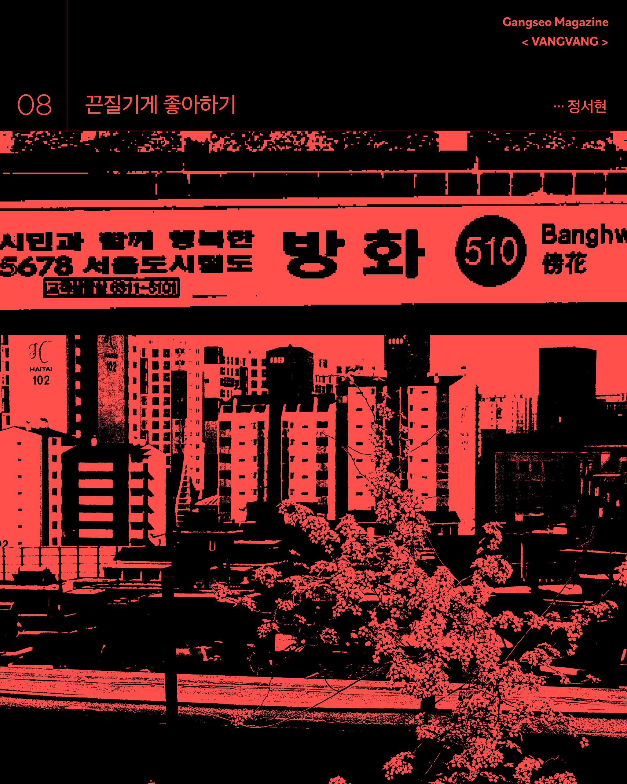 끈질기게 좋아하기 어떤 사람이 한 동네에서 머무르기 위해 필요한 것이 무엇이라고 생각하는가. 고소한 원두 냄새를 풍기는 카페, 좋아하는 산책로, 안전한 거리, 마음 둘 수 있는 단골 가게 같은 것들이 있을 것이다. 나는 늘 그것이 끈질긴 땅이라고 생각해 왔다. 흙은 눅눅한 데다 습기가 가득해서 늘 물기를 머금 고 있는 것만 같은 땅. 흙의 생태적 변동과 온도에 민감하지 않은 땅은 그다지 아름답진 않다. 그 자리에 나는 식물은 늘 그 자리에 똑같이 자라나는 것이다. 나는 방화동에 왔던 일을 또렷하게 기억하고 있다. 그 나무는 내가 방화동에 와서 제일 먼저 본 것이다. 집 앞에 있는, 언제부터 그 자리에 있었을지 모르는 나무를 관찰하는 것은 나에게 곧 익숙한 일이 되었다. 방화 3동에 있는 근린공원으로 가는 길목에 있는 것인데, 그 나무는 여전히 살아가고 있다는 인상을 주었다. 이 땅에서 나와 저 나무가 만난 것을 생각한다. 나(혹은 나무)는 방화동에 살고 있다. 나(혹은 나무)는 방화동에 살았다. 나(혹은 나무)는 방화동에 살 것이다. 이것은 지나간 현재와 다가올 현재에 해당한다. 방화동은 서울의 끄트머리에 있는 구에 속해있는 동네인데, 어렸을 적 부터 쭉 살아왔던 친구들이 많은 곳이다. 그러니까 한번 발을 들이면 떠나가기 어려울 만큼 매력이 있는 동네라는 이야기다. 나 역시 여덟 살 무렵 방화동으로 이사 왔다. 나의 키와 둘레보다 훨씬 커다란 나무를 보았을 때 이 동네에 대한 모든 첫인상이 결정되었다고 할 수 있겠다. 둘레가 두꺼운 나무가 꽤 있는 곳, 대로변보다 샛길을 찾게 되고 이어져 있는 길을 따라 낯선 곳에 가기를 망설이게 되지 않는 곳, 두 팔로 안을 수 없을 만큼 거대 한 시간이 숨어져 있는 시간을 품고 있는 곳. 이것은 앞서 얘기한 끈질긴 속성과 연결되어 있다. 나는 무언가 끈질기게 한 경험이 많지 않다. 늘 나를 즐겁게 만드는 것 들은 여기저기 많이 분포되어 있었고 나는 그것들을 모조리 한 번씩은 들여다봐야 직성이 풀리는 아이였다. 정수정(가명)은 나와 달랐다. 정수정은 나와 어릴 적부터 방화동에서 함께 살고 있는 단 한 명의 친구라고 할 수 있다. 정수정과 첫 만남은 그녀가 잃어버렸던 강아지를 함께 찾았던 기억부터 시작된다. 당시 정수정과 함께 살던 강아지는 짧은 흰 털을 가지고 주둥이 가 길쭉했던 아이였는데, 한창 뛰어놀고 싶어 하는 나이(인간으로 치면 6-7 살 정도 되었을)였던 것으로 기억한다. 나는 방화 3동에 있는 근린공원에서 언니와 놀고 있었고 정수정은 홀로 울면서 돌아다니고 있었다. 언니는 특유의 친화력으로 정수정에게 다가가 자초지종을 물었고 이내 우리는 함께 강아지를 찾아 나서게 되었다. 정수정이 핸드폰 사진으로 보여준 강아지는 아 무것도 모르는 채 해맑게 혀를 내밀고 미소 짓고 있었다. 정수정은 강아지를 찾았다. 정수정이 아니라 정수정의 어머니가 아파트 단지에서 강아지를 데리고 있던 할머니들에게서 찾았다며 연락을 해 온 것이다. 그 이후로 나는 정수정과 자연스레 친해졌고(언니는 우리와 나이 차이가 꽤 났으므로 같이 어울려 다니는 일이 줄었다) 가끔은 정수정의 강아지도 만나게 되었다. 정수정의 강아지 도도(가명)는 무엇을 보고 무엇을 느끼고 있는지 모를 만큼 커다란 눈망울을 재빠르게 깜빡거리는 애였다. 도도는 지금도 어딘가에서 열심히 무언가의 냄새를 맡으며 뛰어다니고 있을 것 이다. 정수정의 끈질김은 익숙한 것에 있다. 이것이 나와 다른 점이다. 정수정 은 익숙한 길로 산책하는 과정을 즐긴다. 똑같은 것에서 안정감은 물론이고 변화도 느낀다는 것이다. 나는 길을 잃는 것을 즐기는 편이다. 사실 방화동에서 길을 잃기란 쉬운 일이 아니다. 심지어 방화동에서 이십여 년 넘게 살고 있는 사람은 더더욱 그렇다. 나의 산책은 익숙한 것에서 벗어나기를 시도한다는 것에 있다. 그러나 벗어남은 어쩐지 끈질김과는 다른 것이어서 나는 나를 끈질김의 부류와 다르다고 생각해 왔다. 그때 정수정이 나에게 해 주었던 말이 있다. 늘 좋아하기 때문이야. 정수정은 나에게 늘 좋아하기 때 문에 벗어나도 문제가 없고 길을 잃어도 다시 돌아올 힘이 생기는 거라고 말했다. 간혹 이런 생각을 한다. 그 자리에 늘 똑같이 자라나는 식물 같은 정수정, 색다른 길을 찾아도 꼭 이어지는 길과 같은 정수정, 민감하진 않지 만 그만큼 포용력이 강한 정수정. 나의 끈질긴 땅은 정수정과도 닮았다. 그 리고 그것이 방화동과도 같다고 나는 생각하는 것이다. 정수정이 살고 있는 방화동과 우리가 만난 동네에서 여전히 같은 길로만 산책을 하는 정수정을, 더 이상 새로운 길을 찾지 못했지만 그것에서도 만족감을 느끼게 된 나를. 그 모든 것을 우리는 끈질기게 좋아하고 있다. 정서현방화동 거주. 게으르게 사는 것에 관심이 많음