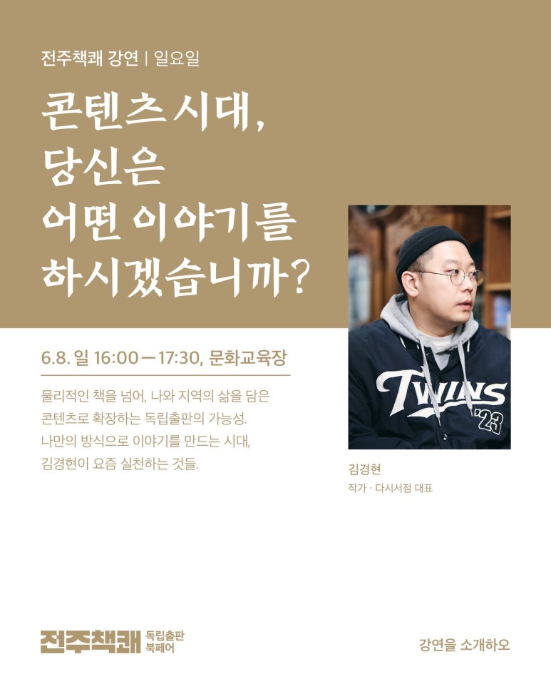 “지금은 누구나 이야기를 만들 수 있는 시대입니다.질문은 단 하나. ‘당신은 어떤 이야기를 할 것인가?’”🎞 강연 소개지난 10여 년, 독립출판은 한국 사회에 뿌리내린 하나의 문화적 흐름이 되었습니다.소규모 출판사, 1인 작가, 동네서점, 로컬 북페어, 유튜브 채널에 이르기까지—이제 우리는 종이책을 넘어 자기 삶과 지역의 이야기를 콘텐츠로 확장하는 시대를 살고 있습니다.이 강연은 다시서점 대표이자 작가로 활동 중인 김경현이독립출판을 중심으로 경험해온 이야기의 힘, 지역성과 콘텐츠의 연결,디지털 시대의 로컬 스토리텔링 전략까지 깊이 있게 다룹니다.💡 주요 키워드독립출판의 변화와 현재로컬 콘텐츠와 지역성의 힘유튜브, AI와 콘텐츠 확장의 가능성쿠마몬·펭수·전주한옥마을 등 로컬 성공 사례 분석소수자의 이야기, 틈새 콘텐츠, 진정성의 가치관광과 출판의 패러다임 전환‘나만의 이야기’를 찾는 창작자의 질문🧭 이런 분께 추천합니다✔ 독립출판을 준비 중이거나 관심 있는 분✔ 로컬 콘텐츠 기획자, 서점·문화 공간 운영자✔ 콘텐츠 크리에이터 또는 지역 기반 창작자✔ 자기를 기록하고 세상과 연결하고 싶은 모든 이🎤 강연자 | 김경현 (작가·다시서점 대표)📅 2025년 6월 8일 일요일🕓 시간 | 오후 4시 ~ 5시 30분📍 장소 | 문화교육장📌 참고 링크다시서점 공식 인스타그램: @dasibookshop강연자의 유튜브 다큐 시리즈 @WALKSGANGSEO➤ 당신만의 이야기를 시작해보고 싶다면?➤ 지역에서, 일상에서 콘텐츠를 만들고 싶다면?➤ 이 강연이 도움이 되었다면 댓글과 좋아요로 응원해주세요!