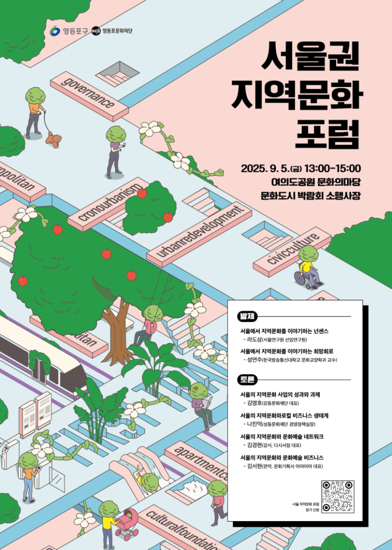 [일시] 2025. 9. 5.(금) 13:00-15:00[장소] 여의도공원 문화의마당 문화도시 박람회 소행사장 [발제]서울에서 지역문화를 이야기하는 넌센스 ‒ 라도삼(서울연구원 선임연구원)서울에서 지역문화를 이야기하는 희망회로 ‒ 성연주(한국방송통신대학교 문화교양학과 교수) [토론]서울의 지역문화 사업의 성과와 과제 ‒ 김영호(강동문화재단 대표)서울의 지역문화와 로컬 비즈니스 생태계 ‒ 나진억(성동문화재단 경영정책실장)서울의 지역문화와 문화예술 네트워크 ‒ 김경현(강서, 다시서점 대표)서울의 지역문화와 문화예술 비즈니스 ‒ 김서현(관악, 문화기획사 아야어여 대표)주최주관 영등포구, 영등포문화재단현장운영 (주)문화디자인자리 - 서울권 지역문화 포럼서울의 지역문화와문화예술 네트워크아무것도 없어서할 수 있는 이야기와할 수 없는 이야기서울 강서구는 조선시대 양천현과 금포현의 경계였고, 1914년 이후에는 김포군 양동면·양서면으로 편제되었으며, 1963년 서울시 확장 때 김포·부천에서 편입되어 처음에는 영등포구 관할이었습니다. 1977년에는 영등포구에서 분리되어 강서구가 신설되었고, 1988년에는 동쪽의 목동·신정·신월동이 분리되어 양천구가 탄생하는 등 행정 경계가 여러 차례 변동되었습니다.당시 강서구는 전체 면적의 절반 이상이 녹지였고 나머지는 대부분 논이었으며, 산발적으로 주민들이 거주했습니다. 여의도비행장이 김포비행장으로 기능과 시설을 옮기고, 그 시기 강남으로 인식되던 영등포의 기능이 확장되면서 강서구로 새로운 인구 유입이 시작되었으며, 김포국제공항의 기능 확장과 공장 증가에 더해 이촌향도로 서울로 이주한 사람들이 비교적 저렴한 지역을 찾아 들어오면서 인구가 늘어났습니다.강서구의 지역문화를 이해하기 위해서는 행정 경계 변화와 주변 생활권의 상호작용을 함께 보아야 합니다. 강서는 김포·부천·인천과 공항·물류·통근권이 맞물려 일상 동선과 상업 문화가 교차하고, 영등포·여의도 축과는 방송·금융·서비스업 고용권이 연결되며, 양천과는 분구 이전부터 이어진 주거·교육·상권의 연속성이 유지되었습니다.공간적으로는 한강·경인·올림픽대로가 이동과 교류를 이끌었고, 기능적으로는 김포국제공항과 마곡지구가 이주·관광·혁신산업의 문화를 형성했습니다. 또한 주민들의 생활사 현장과 양천향교, 허가바위 등 지역 기억 자원이 전통·근대·현대의 층위를 이어왔습니다.서울 중심부를 제외하고 뒤늦게 편입된 다수 자치구가 겪는 “지역문화란 무엇인가”라는 질문은 고유한 지역문화와 새롭게 만들어가는 지역문화 사이의 단절에서 비롯되었습니다. 강서구 또한 마찬가지로, 문화 인프라가 부족하고 주민들의 일상 문화 접근이 제한적이었습니다. 주민과 기획자들이 공통적으로 이야기한 것은 “문화예술을 즐길 공간이 거의 없다”라는 점이었으며, 이로 인해 문화적 자존감과 지역 정체성이 약화하였다는 지적이 있었습니다.이 공백을 메운 대표적인 사례가 ‘N개의 서울’ 프로젝트입니다. 강서 N개의 서울은 지역의 예술인, 생활문화 동아리, 청년 기획자들을 연결했고, 연구 모임, 워크숍, 독립출판 마켓, 지역문화 지도 제작 등 다양한 프로그램을 시도했습니다. 청년 기획자 교육과정도 운영해 지역 활동 인력을 길러냈습니다. 사실상 공공이 맡아야 할 중간지원조직의 기능을 민간이 먼저 수행한 셈이었습니다. 그러나 이러한 민간 네트워크는 제도적, 행정적 뒷받침이 없었기 때문에 항상 불안정했고, 재정 지원도 없어 장기적으로 이어가기 어려운 구조였습니다.그 원인은 강서구에 문화재단이 없다는 데 있습니다. 서울 25개 구 중 22개 구는 문화재단을 운영하고 있지만 강서구는 아직도 설립 계획조차 없습니다. 문화재단이 없으니 국·시비 보조금을 확보하기 어렵고 장기적인 문화정책을 추진하기 힘듭니다.강서구는 문화재단 대신 문화원을 통해 역할을 대신할 수 있다고 주장하지만, 문화원은 민법상 사단법인일 뿐 공공재단이 아닙니다. 국가나 서울시의 예산을 직접 받을 권한이 없고, 전문 인력이 부족합니다. 결국 위탁 운영과 시설 관리에 머물 수밖에 없으며, 이는 문화재단의 기능을 대체할 수 없습니다.실제 행정을 보면 문제는 더욱 뚜렷합니다. 강서구의 문화정책은 중장기 전략이 부재하고, 축제와 행사 위주로 예산이 흩어져 있습니다. 예술인 수당은 20년 가까이 동결되어 있었고, 청년주간은 버스킹 공연 하나로 갈음되었습니다. 구립도서관과 박물관, 미술관은 대부분 민간 위탁에 의존하며, 특정 단체 중심의 위탁 구조로 인해 민주성이 부족하다는 지적이 많았습니다.강서아트리움 운영의 경우 본예산에 충분히 반영되지 못한 공연비를 매년 추경으로 보충하는 악순환이 이어졌으며, 허준축제는 외부 유명 가수 섭외에 수천만 원을 쓰면서도 정작 지역 예술인의 참여는 제한적이었습니다. 이는 지역 예술생태계에 기여하지 못하는 방식이었습니다.따라서 필요한 과제는 분명합니다.첫째, 민간 네트워크를 제도화해야 합니다. ‘강서 N개의 서울’과 같은 실험은 가능성을 보여주었고, 공공은 이를