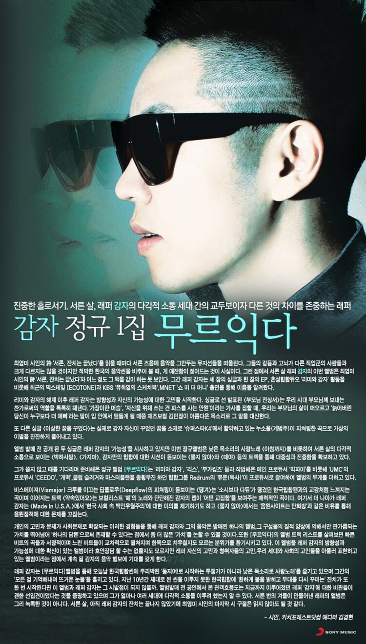 감자 [무르익다] 보도자료 Client: SONY MUSICReleased: 2012.10.05 진중한 홀로서기. 서른 살, 래퍼 감자의 다각적 소통세대 간의 교두보이자 다른 것의 차이를 존중하는 래퍼 감자 정규 1집 [무르익다] 최영미 시인의 詩 '서른, 잔치는 끝났다'를 읽을 때마다 서른 즈음에 음악을 그만두는 뮤지션들을 떠올린다. 그들의 갈등과 고뇌가 다른 직업군의 사람들과 크게 다르지는 않을 것이지만 척박한 한국의 음악씬을 비추어 볼 때, 쉽게 애잔함이 젖어드는 것이 사실이다. 그런 점에서 서른 살 래퍼 감자의 이번 앨범은 최영미 시인의 詩 '서른, 잔치는 끝났다'와 어느정도 그 맥을 같이 하는 듯 보인다. 그간 래퍼 감자는 세 장의 싱글과 한 장의 EP, 혼성힙합듀오 '리미와 감자' 활동을 비롯해 최근의 믹스테잎 [ECOTONE]과 KBS '유희열의 스케치북', MNET '쇼 미 더 머니' 출연을 통해 이름을 알려왔다. 리미와 감자의 해체 이후 래퍼 감자는 방향성과 자신의 가능성에 대한 고민을 시작한다. 싱글로 선 발표된 <부모님 전상서>는 우리 시대 부모님께 보내는 찬가로써의 역할을 톡톡히 해낸다. '가장이란 머슴', '자신을 위해 쓰는 건 파스를 사는 만원'이라는 가사를 접할 때, 우리는 부모님의 삶이 떠오르고 '늙어버린 당신이 누구보다 더 예뻐'라는 말이 입 안에서 맴돌게 될 때쯤 재즈보컬 김민정이 아름다운 목소리로 그 말을 대신한다. 또 다른 싱글 <이상한 꿈을 꾸었다>는 실제로 감자 자신이 꾸었던 꿈을 소재로 '슈퍼스타K4'에서 활약하고 있는 누소울(계범주)이 피쳐링한 곡으로 가상의 이별을 잔잔하게 풀어내고 있다. 앨범 발매 전 공개 된 두 싱글은 래퍼 감자의 '가능성'을 시사하고 있지만 이번 정규앨범은 낮은 목소리의 사랑노래 <아침까지>를 비롯하여 서른 살의 다각적 소통으로 보이는 <박하사탕>, <가지마>, 감자만의 힙합에 대한 시선이 돋보이는 <쫄지 않아>와 <때야> 등의 트랙을 통해 대중성과 진중함을 확보하고 있다. 그가 쫄지 않고 때를 기다리며 준비해온 정규앨범 [무르익다]는 '리미와 감자', '긱스', '부가킹즈' 등과 작업해온 메인 프로듀서 '빅파이'를 비롯해 'UMC'의 프로듀서 'CEEDO', '개떡', 클럽 슬러거와 마스터플랜을 종횡무진 하던 힙합그룹 Redrum의 '유운(독사)'이 프로듀서로 참여하여 앨범의 무게를 더하고 있다. 비스메이져(Vismajor) 크루를 이끄는 딥플로우(Deepflow)의 피쳐링이 돋보이는 <땡겨>는 '소시보다 다듀'가 땡겼던 한국힙합팬과의 교감처럼 느껴지는 곡이며 이어지는 트랙 <약속있어요>는 보컬리스트 '혜'의 노래와 단단해진 감자의 랩이 '어떤 교집합'을 보여주는 매력적인 곡이다. 여기서 더 나아가 래퍼 감자는 에서 '한국 사회 속 백인우월주의'에 대한 이의를 제기하기도 하고 <쫄지 않아>에서는 '음원사이트는 만화방'과 같은 비유를 통해 음원정책에 대한 문제를 꼬집는다. 개인의 고민과 문제가 사회문제로 확장되는 이러한 경험들을 통해 래퍼 감자와 그의 음악은 발매된 하나의 앨범, 그 구성물의 질적 양상에 의해서만 판가름되는 가치를 뛰어넘어 '하나의 담론'으로써 존재할 수 있다는 점에서 좀 더 많은 '가치'를 논할 수 있을 것이다. 또한 [무르익다]의 앨범 트랙 리스트를 살펴보면 빠른 비트의 곡들과 서정적이며 느린 비트들이 교차적으로 펼쳐지며 한쪽으로 치우칠지도 모르는 분위기를 환기시키고 있다. 이 앨범을 래퍼 감자의 방향성과 가능성에 대한 확신이 있는 앨범이라 호언장담 할 수는 없을지도 모르지만 래퍼 자신의 고민과 청취자들의 고민, 우리 세대와 사회의 고민들을 아울러 표현하고 있는 앨범이라는 점에서 계속 될 감자의 음악 행보에 기대를 갖게 한다. 래퍼 감자는 [무르익다]앨범을 통해 오늘날 한국힙합씬에 뿌리박힌 '동지여!로 시작하는 투쟁가가 아니라 낮은 목소리로 사랑노래'를 즐기고 있으며 그간의 '모든 걸 기억해내며 뜨거운 눈물'을 흘리고 있다. 지난 10년간 제대로 된 씬을 이루지 못한 한국힙합에 '환하게 불을 밝히고 무대를 다시 꾸미는' 잔치가 또 한 번 시작된다면 이 앨범과 래퍼 감자는 그 시발점이 되지 않을까. 앨범발매 전 공연에서 본 관객호응도는 지금까지 이루어졌던 래퍼 '감자'에 대한 비판들이 괜한 선입견이었다는 것을 증명하고 있으며 그가 얼마나 여러 세대에 다각적 소통을 이루려 했는지 알 수 있다. 서른 번의 겨울이 만들어낸 래퍼의 앨범은 그리 녹록한 것이 아니다. 서른 살, 아직 래퍼 감자의 잔치는 끝나지 않았기에 최영미 시인의 마지막 시 구절은 읽지 않아도 될 것 같다.