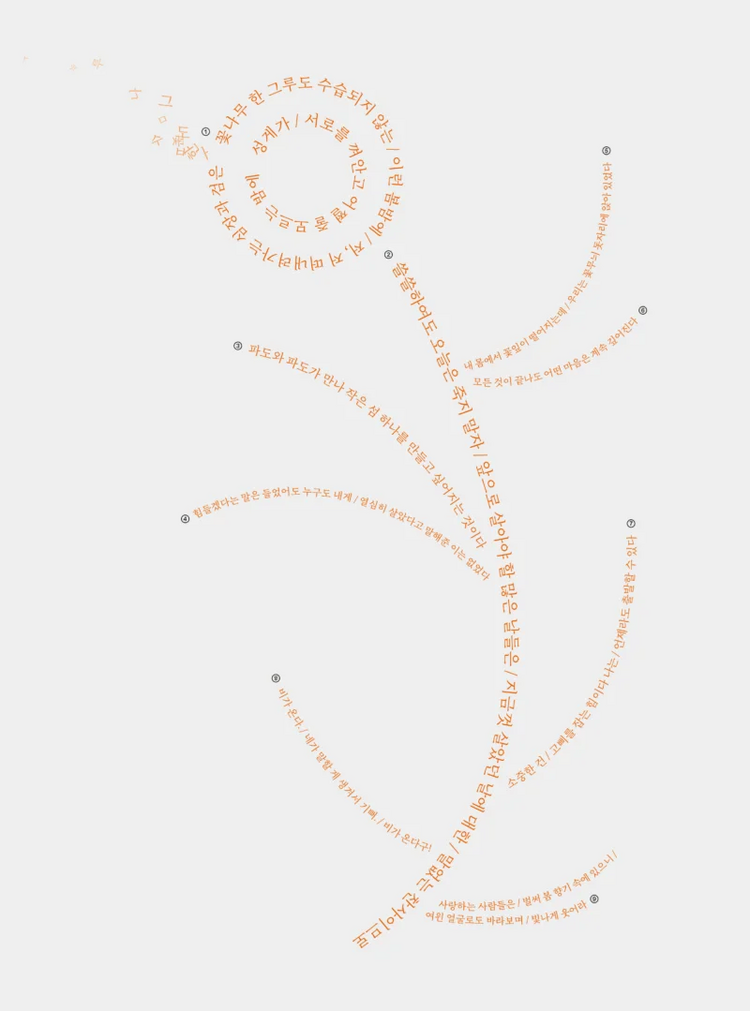 힘내라는 말 대신. 다시서점 김경현 대표가 받아 적은 무언의 갈채들. ① 마음이 요동쳐 어쩔 줄 모르는 봄밤에는, ‘성게’를 추천합니다.<연인들은 부지런히 서로를 잊으리라> ‘성게’ 박서영 | 문학동네, 2019.② 위태로움도 꺼지지 않은 불티이기에, 언젠가 씨가 되고, 다시 꽃이 되어 활활 타오를 것이기에.<햄버거에 대한 명상> ‘지하 인간’ 장정일 | 민음사, 1987.③ 만남은 파도처럼 내리치지만 우리는 그 인연을 쉽게 놓치곤 합니다. 내일은 잠시 잊고 있던 사람에게 연락해보는 건 어떨까요. 마음에 작은 섬을 만들 수 있지 않을까요.<중국인 맹인 안마사> ‘ 나에게로 파도가 친다’ 심재휘 | 문예중앙, 2014.④ “힘내”라는 말이 위로가 되지 않을 때가 있습니다. 더 이상 힘을 내기 어려울 때 나 자신에게, 가족과 주변 사람들에게 “열심히 살았네요”라는 말을 건네보세요.<새를 따라서> ‘서점 버티고를 나서며’ 박철 | 아시아, 2022.⑤ 따뜻한 봄. 꽃잎이 흩날리는 곳에 함께 앉아 시간을 나누고, 이 시를 읽으면 그 무엇이 필요하겠어요.<미기후> ‘피크틱’ 이민하 | 문학과지성사, 2021.⑥ 힘든 시기를 겪는 친구에게 어떤 말을 해야 할까요. 모든 것이 끝난 것처럼 느껴지더라도 우리는 깊어지는 마음에 관한 이야기를 나누었으면 해요.<두부를 구우면 겨울이 온다> ‘두부를 구우면 겨울이 온다’ 한여진 | 문학동네, 2023.⑦ 시작하는 힘은 언제나 손끝과 발끝에 있다고 믿습니다. 망설임과 두려움 앞에서 머뭇거리고 있다면 우리에게는 작지만소중한 힘이 있다 는 걸 잊지 않았으면 합니다.<순수의 시대> ‘떠날 때 1’ 전윤호 | 달아실, 2017.⑧ 비가 올 때마다 비 냄새를 좋아하던 친구가 떠오릅니다. 아직도 비가 오면 창문을 열고 웃을까요. 시인은 빗방울이 되어, 시가 되어 신나게 날아갑니다. 오늘은 비에 흠뻑 젖어볼까요.<나의 침울한, 소중한 이여> ‘나의 침울한, 소중한 이여’ 황인숙 | 문학과지성사, 1998.⑨ 사람들의 웃는 표정을 떠올려봅니다. 괜스레 따라 웃어봅니다. 사랑하는 사람들이 손을 잡고 걷는 모습을 떠올리면서 어떤 괴로움 속에서도 웃음꽃은 지지 않기를 바라봅니다.<아름다운 손> ‘사랑하는 사람들만 무정한 세월을 이긴다’ 나해철 | 창작과비평사, 1993. 지큐코리아 2024.05