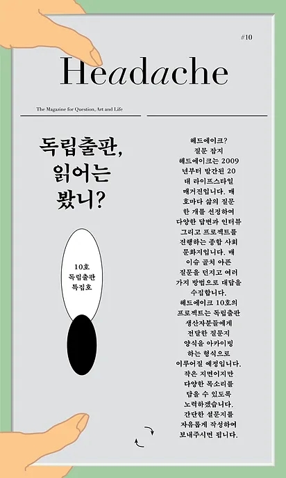 헤드에이크 10호진정한 독립과 해방을 위하여, 독립출판에 대한 SNS를 훔쳐보며독립출판에 대한 의견은 다분하다. *‘다양한 사람들의 독특한 생각들을 엿볼 수 있는 곳, 정형화 되지 않은 소재와 형식, 책의 크기와 종이의 재질까지 어느 것 하나 같지 않음이 이곳을 더욱 특별하게 만드는 것 같다.’*는 호의적인 의견부터 *‘얄팍한 두께의 책과 그림이 왜 이렇게 비싼 거야?’*라는 냉담한 의견까지. 보는 관점에 따라 의견은 다르겠지만 직접 참여하고 있는 입장에서 바라본 독립출판은 여전히 쉽지만은 않은, 그러나 재미있는 작업이다.2013년 한 해 동안 다양한 마켓에 참여했다. ‘세종예술시장 소소’를 비롯해 ‘이태원 계단장’, 와우북에서 연 시민청 마켓과 합정 메세나폴리스 마켓, 울산도서전, 상상공장의 돌예공 등. 그곳에서 수많은 독립출판을 만났고 때로는 서로 구입하기도 했다. 내가 만난 독립출판물들은 제각기 각자의 개성이 너무도 빛났다. 하지만 ‘비슷한 편집 스타일이 주를 이루는 모습’은 제작자들이 자성해야 할 점이다. ‘고딕체 일변도의 2-3단 칼럼 / 제목과 첫 줄은 5-8자 들여쓰기 / 사진은 여백 없이 재단선 까지 깔기 / 텍스트는 약간 작게 (노성일님 SNS).’ <헤드에이크>도 과연 이 지적을 피해갈 수 있을까. 아마 독립출판을 하고 있는 제작자 모두 이 부분을 좀 더 세심하게 고려해야 할 것이다.지적 받는 다고 기분 나빠할 필요는 없다. ‘앞으로 더 잘하면 되니까. 흥~!’이라는 소심한 반항도 가져본다. 그러나 우리는 *‘1-2년 내로 독립출판물의 에너지가 꺾여 경영상의 어려움을 호소하는 곳이 나올 수 있다.’ (오창섭님 SNS)*는 말을 민감하게 숙지할 필요가 있다. 그 동안 사라진 독립잡지들 모두 그 에너지의 꺾임 때문에 모조리 자취를 감추었기 때문이다. 앞서 <싱클레어> 편집장 피터 김용진 인터뷰를 열심히 읽은 독자라면 에너지를 비축하고 유지하는 방법을 확인했겠지만.<지금 여기 독립출판>에서 이야기 하듯 ‘이런 것이 미래를 담보해 줄리 없고 개인적으로도 이런 성과에 연연하지 않는다.’, ‘독립출판이 기성출판보다 도덕적이라거나, 가치 있는 일이라고 생각하지도 않는다.’ 그럼에도 불구하고 우리는 왜 독립출판에 얽매여 있는가. ‘다양성과 취향을 존중하는 것’이라는 말로 우리의 존재를 규정할 수 있는가. 같은 책 전가경님의 말씀처럼 “다양한 ‘취향의 공동체’는 국경 없는 청년문화 혹은 하위문화로서 혼성적인 양태로 확산 될 것’이고 ‘독립출판은 불투명한 미래를 앞둔 청년들이 풀어나갈 수 있는 취향의 소박한 시각화, 작지만 의미 있는 소소한 발언의 장이 될 것이다.” 그러나 이것만으로 우리의 장은 규정될 수 있을까.외국의 경우를 보자. ‘아마존 톱 10에 몇 주간 올라 독립출판으로 히트를 쳤던 작가 PATRICK WENSINK가 번 돈은 $12K 정도. 독립출판이 유행이고 인기더라도 실상(Sung Lee님 SNS)은 이정도 밖에 안 된다.’ 독립은 했으나 자립은 하지 못한 대한민국의 현주소와 독립출판의 한계가 겹쳐 보이는 이유는 무엇일까. 우리의 한계가 ‘페이지 몇 장 안 되는 팜플렛 같은 것이 만 원 이상인 게 이상했다. 인쇄분량 때문인가.(하님 SNS)’*라는 한계를 갖는 이유와 *‘서로의 존재를 확인하며, 맨땅에 헤딩하며 굴을 파고 나오니, 수면 위로 머리를 들고 있는 사람들을 만나는 느낌’(이**님 SNS)*인 이유는 자립에 대한 고민이 심화되지 못한 우리의 현 주소일까."뿔테 안경에 말은 들릴락말락, 인용문이 제목인 블로그 하는 애들 있잖아. 효자동 카페에 다닥다닥 앉아서는 서로에게 전생부터 관심 없었던 척하는 애들 있잖아. 흐릿한 사진에 일러스트 같은 거 섞어 열 페이지짜리 독립출판물 그런 거 만드는 애들 있잖아."(장우철님 SNS) 자, 우리의 고민이 이 정도로 보이는 이유를 단지 관점으로 한정 지어야 할까. 우리는 쉽게 독립출판을 만들어 왔는가. 우리라고 말하는 우리는 어디까지 우리라고 말해야 하는 가. 디자인만으로, 글만으로 평가절하 되어야 하는 현실에서 우리는 무엇을 할 수 있는 가.그럼에도 *'주류 출판업계에서 외면당하는 작품'을 추구하며 여기저기에서, 잠시, 일어난 '독립출판' 붐은 결국 일정한 자본 투자와 그에 따르는 책임, 전문적 편집 과정을 거치는 주류 출판 업계가 그나마 읽을 만한 작품들을 내놓는다는 사실을 일깨워준 듯하다.(Min Choi님 SNS)*는 평가는 어떤 지점에서 독립출판 독자들이 반응하는지 알 수 있다. 이 부분이 독립출판의 존재가치에 일말의 당위성을 갖는 것은 아닐까. 독립출판물을 판매하는 매장들이 곳곳에서 늘어나는 것도 그 반응과 당위에 대한 작은 결과물일지도 모르겠다.나는 이제 위험한 상상을 해본다. 시인 김수영의 말처럼 시가 무용해지는 세상을, 모두가 시인이 되어 모든 말들이 시가 되는 세상을! 내가 바라보는 독립출판 또한 그렇다. 모두가 출판을 하는 세상. 국민에게 보장된 출판의 자유가 당연하게 보장되는 것만이 아니라 좀 더 보편화되고 자유로워지는 것. 그 장벽이 허물어져 그 벽을 만들어 낸 기성 세태에 소심하게 침이라도 뱉는 것. 누가 급을 만들고 격을 세웠을까. 누가 