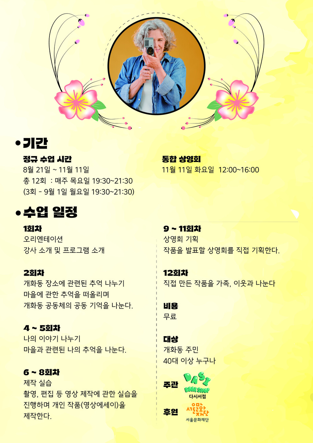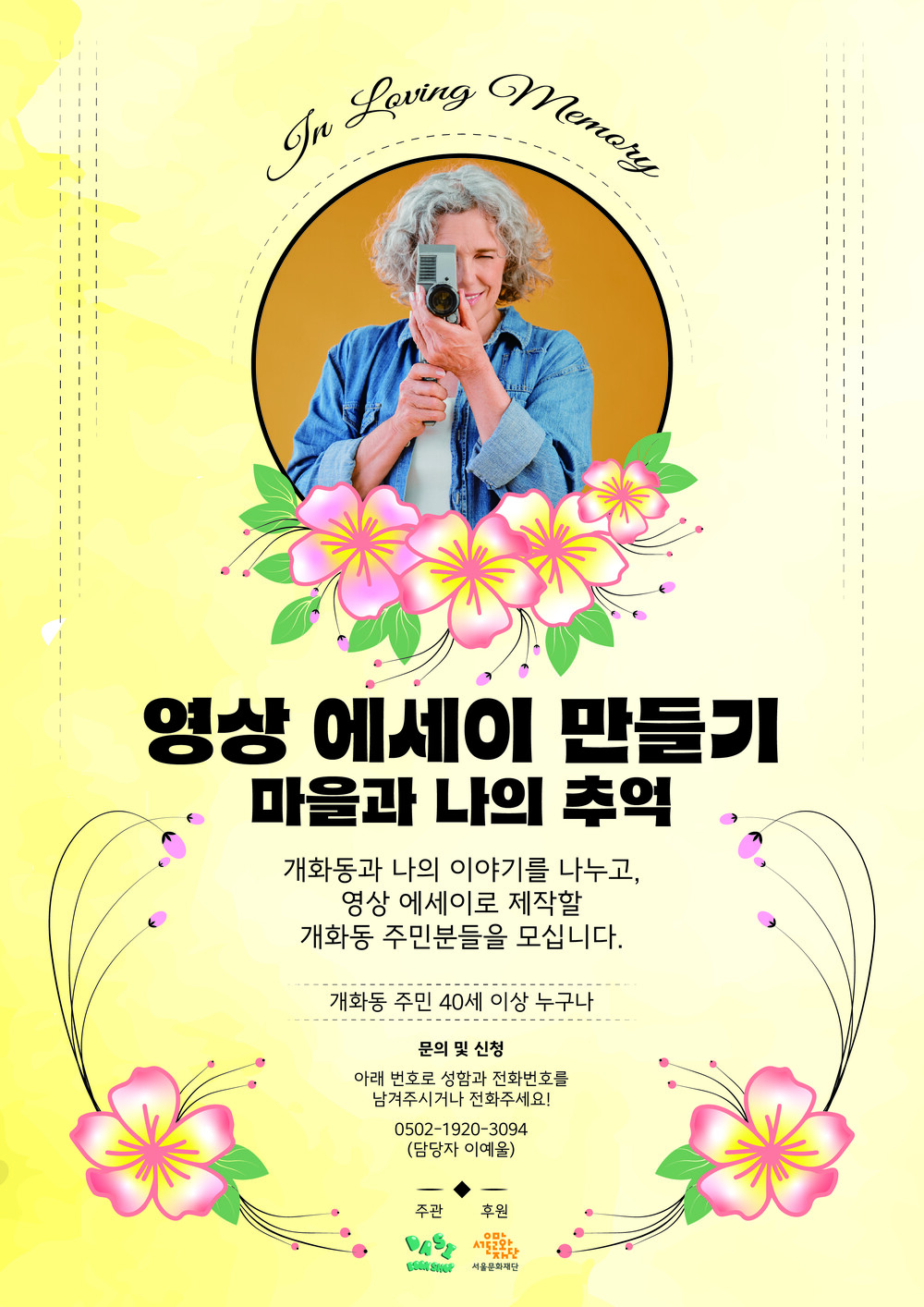 〈영상 에세이 만들기 : 마을과 나의 추억〉은 우리가 살아온 마을이라는 공간을 통해 개인의 기억과 감정을 되돌아보고, 이를 영상이라는 매체로 사유하고 표현해보는 문화예술교육 프로젝트입니다. 빠르게 변화하는 도시와 일상 속에서 마을은 점점 익숙함 속에 묻혀 지나쳐지기 쉽습니다. 그러나 마을은 한 사람의 성장, 관계, 감정이 켜켜이 쌓인 삶의 기록이자 기억의 장소입니다.