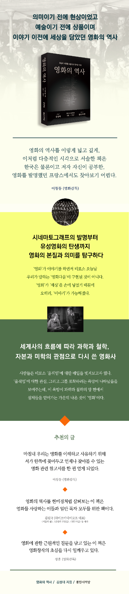 ‘영화’는 태어날 때부터 세상을 스크린 위에 있는 그대로 ‘보여주는 것’으로 출발했다. 영화는 상상해야만 이미지로 떠오르는 세계, 상상해야만 움직이는 세계가 아니라, 눈앞에서 움직이고 살아 있는 세계를 보여주는 것이기에 새롭게 쓰는 영화사는 ‘어떤 영화가 좋은 영화다’를 분별하는 것이 아니라 영화를 이해하고 더 ‘잘’ 보게 하는 근거들을 살펴보는 데 초점을 맞추었다.