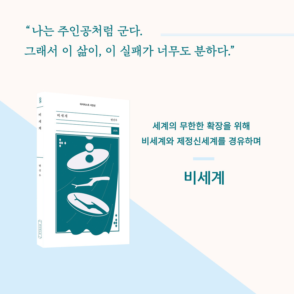 2018년 《동아일보》 신춘문예로 등단한 변선우의 첫 번째 시집 『비세계』가 타이피스트 시인선 006번으로 출간되었다. 등단 당시 김혜순 시인, 조강석 평론가로부터 “소재를 집요하게 응시하는 힘과 다층적 사유를 전개하는 역량을 지닌 신인”이라는 평을 받은 시인은 지금껏 좀처럼 볼 수 없었던 형이상학적 시의 영역을 다루며, 우리가 사는 세계 너머에 존재하는 다세계를 선명한 감각과 충만한 개성으로 선보인다.