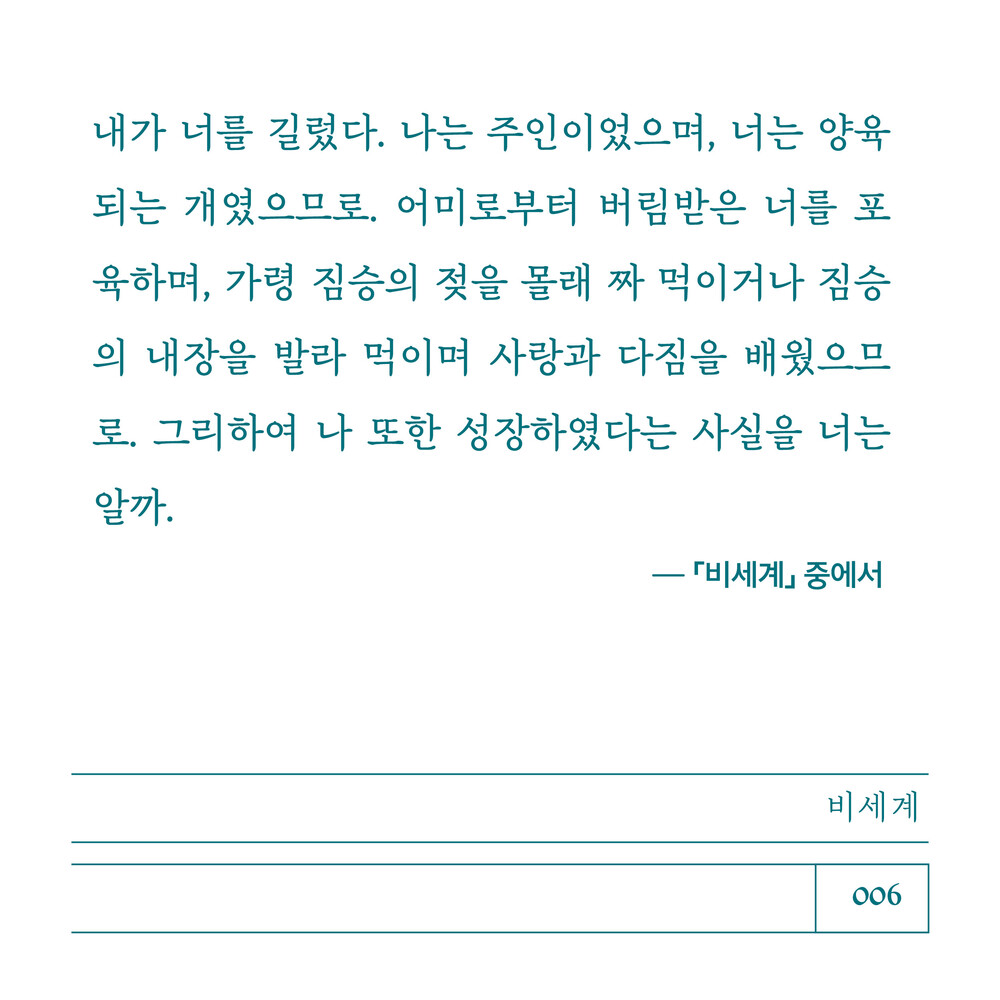 내가 너를 길렀다. 나는 주인이었으며, 너는 양육되는 개였으므로. 어미로부터 버림받은 너를 포육하며, 가령 짐승의 젖을 몰래 짜 먹이거나 짐승의 내장을 발라 먹이며 사랑과 다짐을 배웠으므로. 그리하여 나 또한 성장하였다는 사실을 너는 알까.