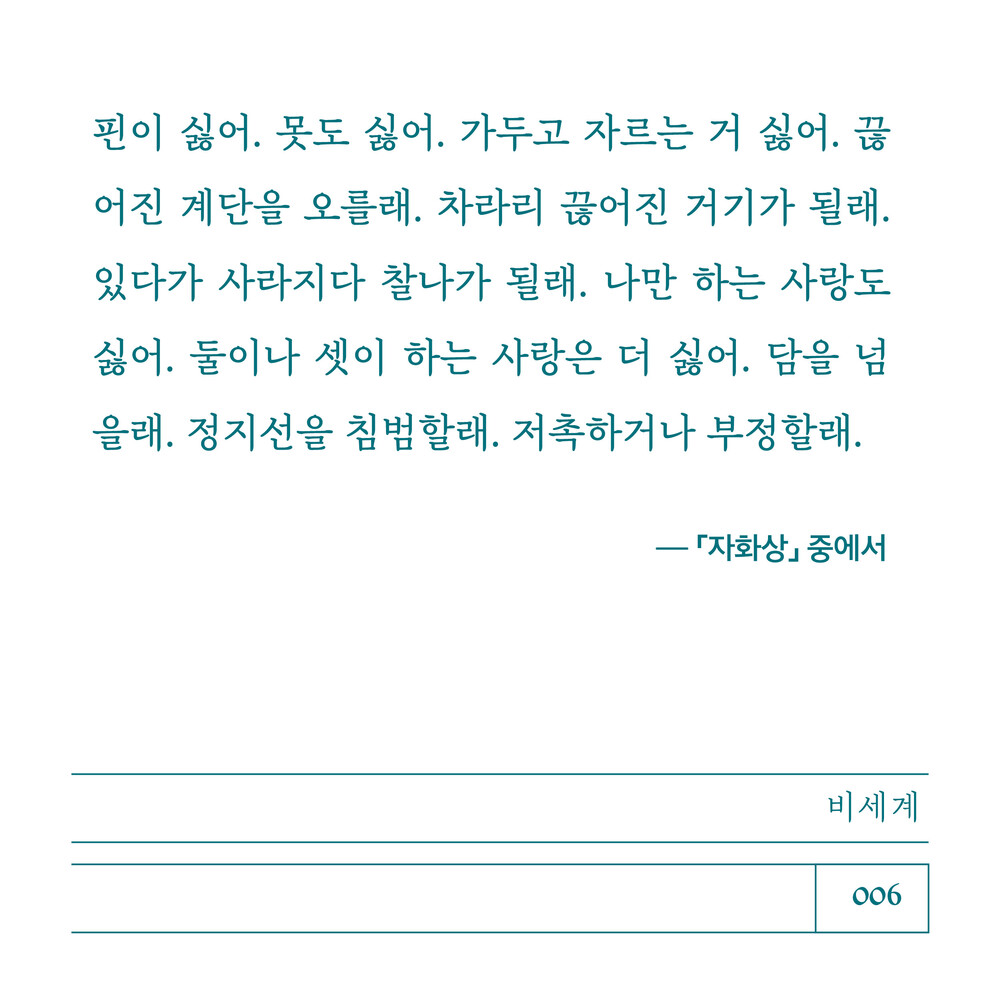 핀이 싫어. 못도 싫어. 가두고 자르는 거 싫어. 끊어진 계단을 오를래. 차라리 끊어진 거기가 될래. 있다가 사라지다 찰나가 될래. 나만 하는 사랑도 싫어. 둘이나 셋이 하는 사랑은 더 싫어. 담을 넘을래. 정지선을 침범할래. 저촉하거나 부정할래.