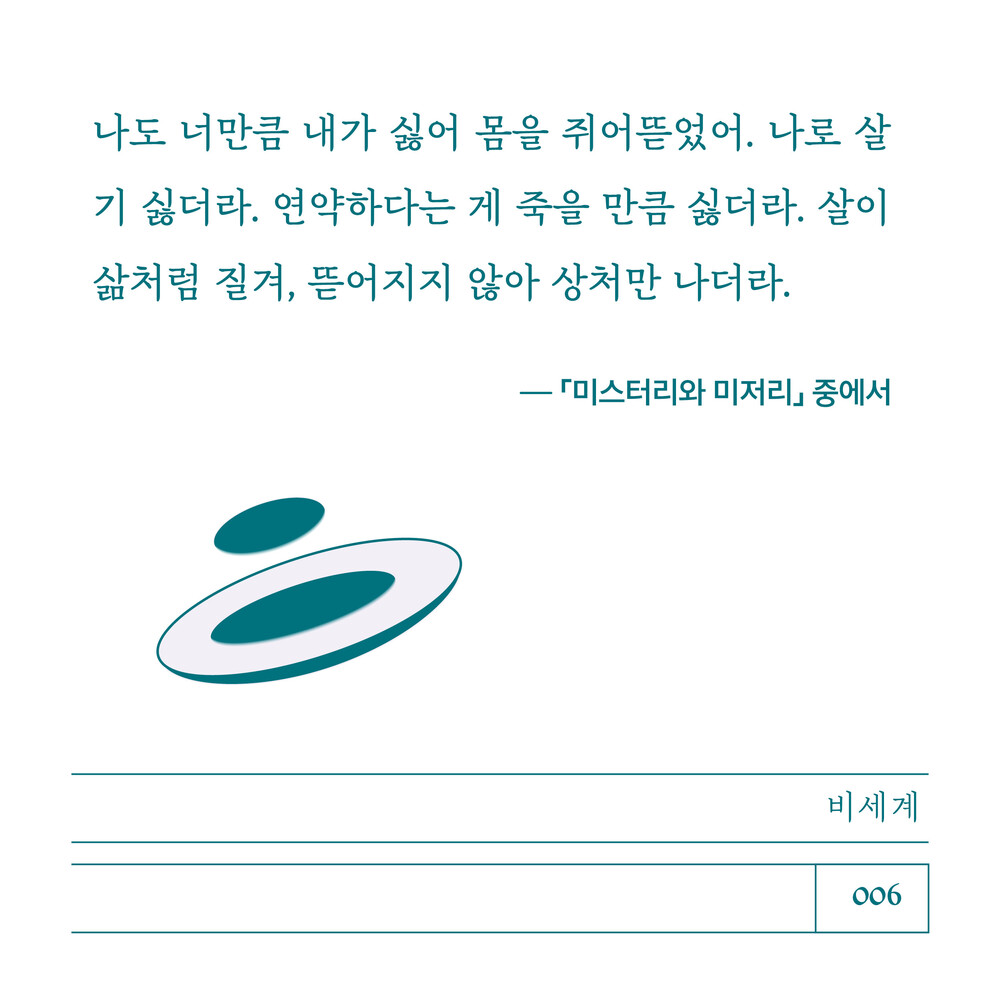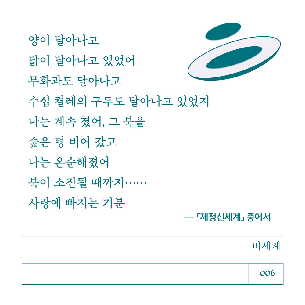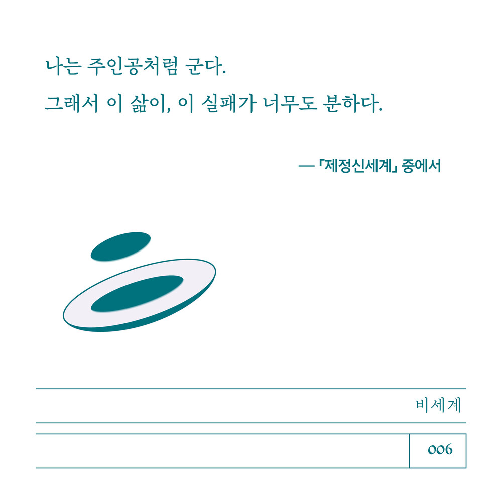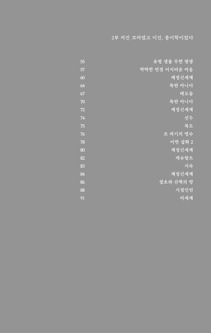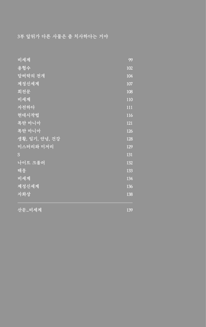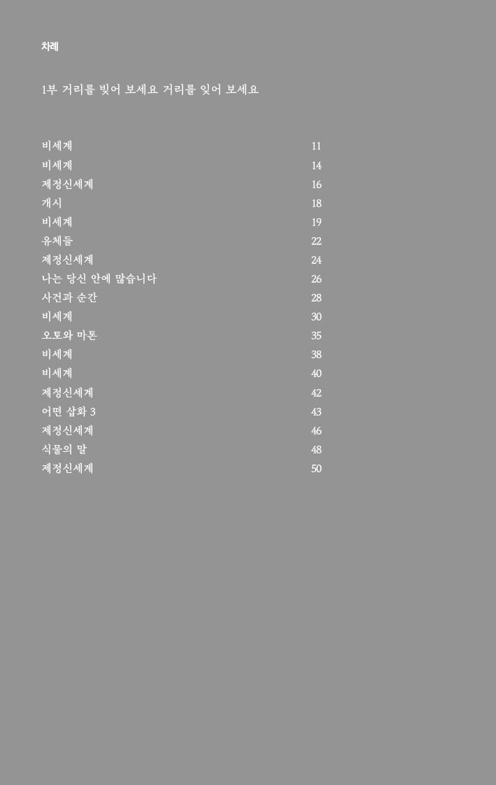 비세계 11/ 비세계 14/ 제정신세계 16/ 개시 18/ 비세계 19/ 유체들 22/ 제정신세계 24/ 나는 당신 안에 많습니다 26/ 사건과 순간 28/ 비세계 30/ 오토와 마톤 35/ 비세계 38/ 비세계 40/ 제정신세계 42/ 어떤삽화3 43/ 제정신세계 46/ 식물의 말 48/ 제정신세계 50
