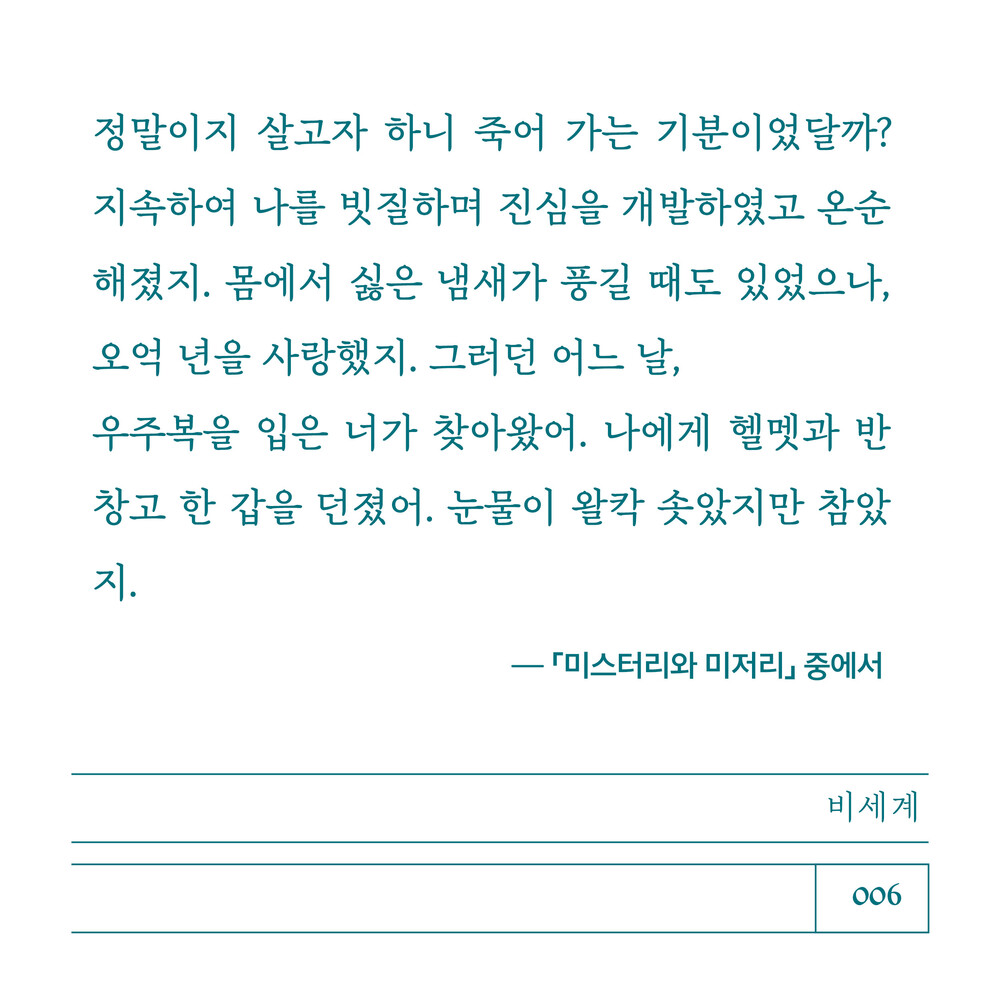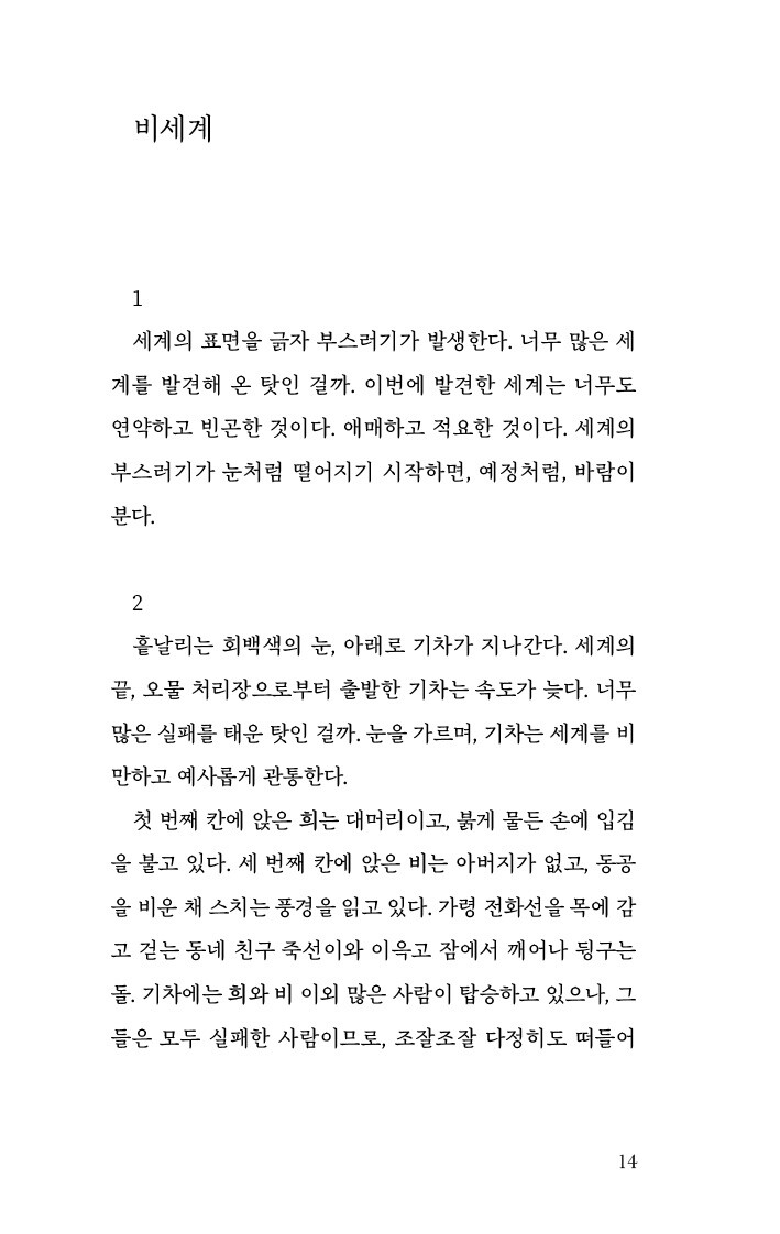 이번 시집은 총 54편의 시와 1편의 산문으로 묶여 있다. ‘비세계’는 세계와 잇닿아 있는 세계, 세계의 “경계” 혹은 “표면” 너머에 있는 세계이다. “나는 이 세계의 경계에 당도하여, 문을 밀어 열듯, 선을 넘어 입장하였어요”라는 전언처럼, 시인은 세계의 무한한 확장을 위해 “비세계”와 “제정신세계”를 경유하며, 역동적이면서도 우리가 생각지 못한 무의식의 방향으로 움직인다.