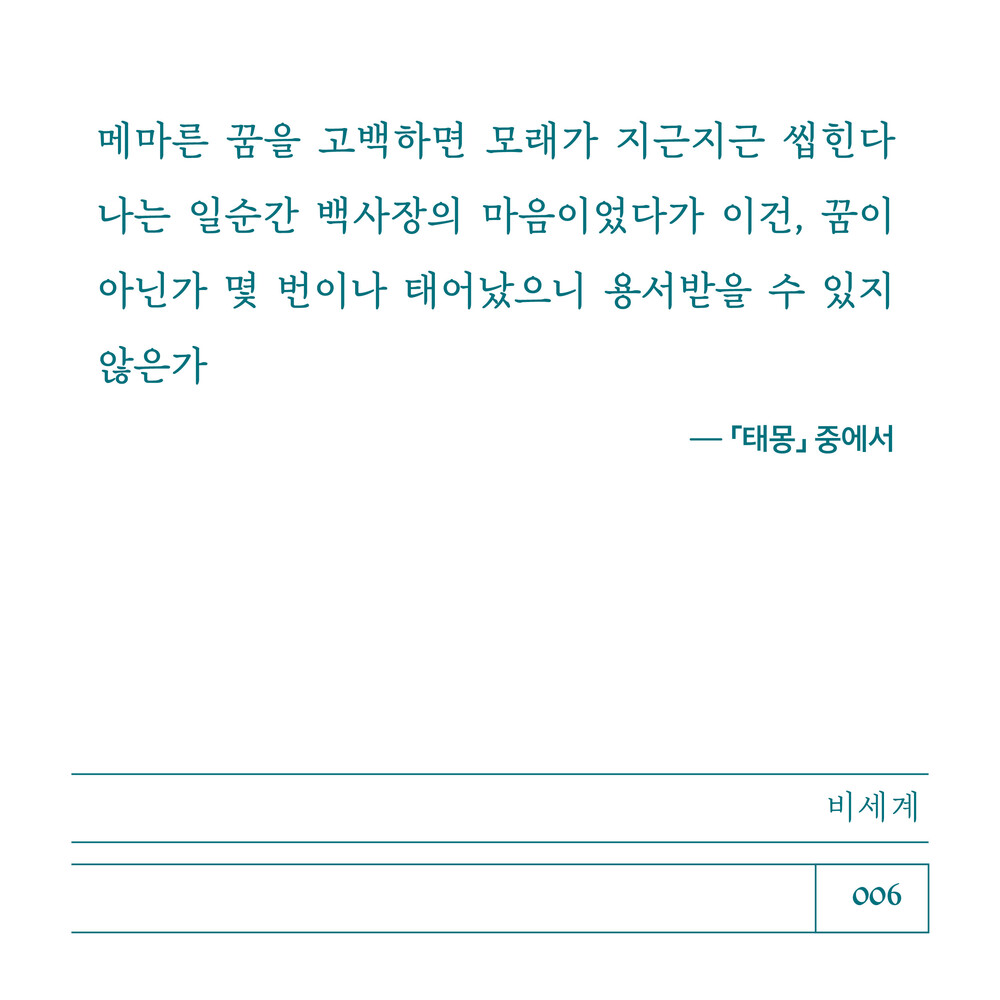 메마른 꿈을 고백하면 모래가 지근지근 씹힌다 나는 일순간 백사장의 마음이었다가 이건, 꿈이 아닌가 몇 번이나 태어났으니 용서받을 수 있지 않은가