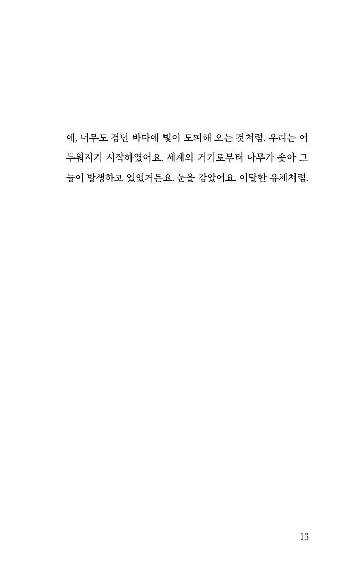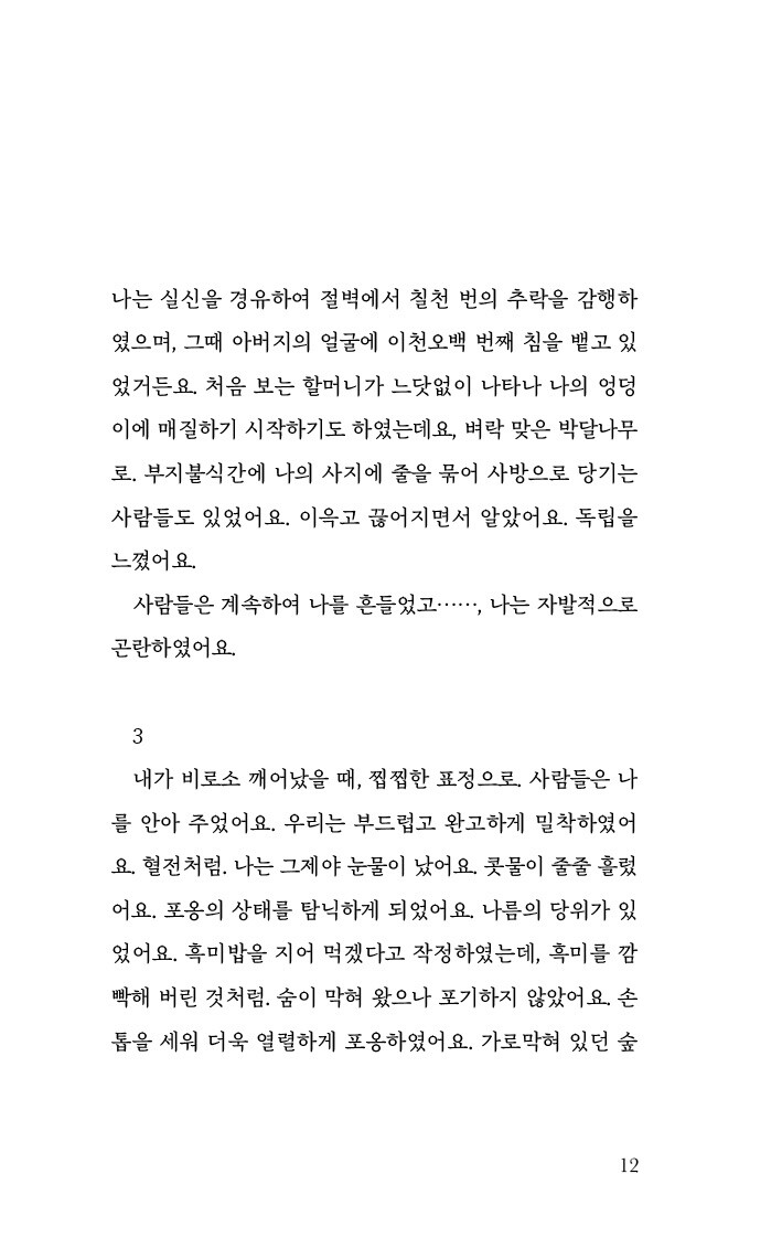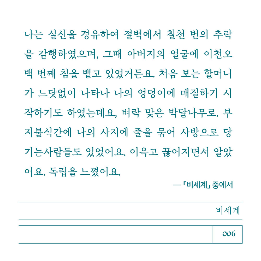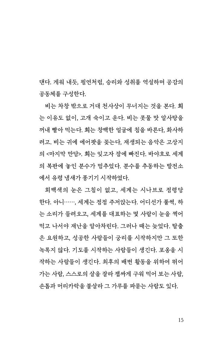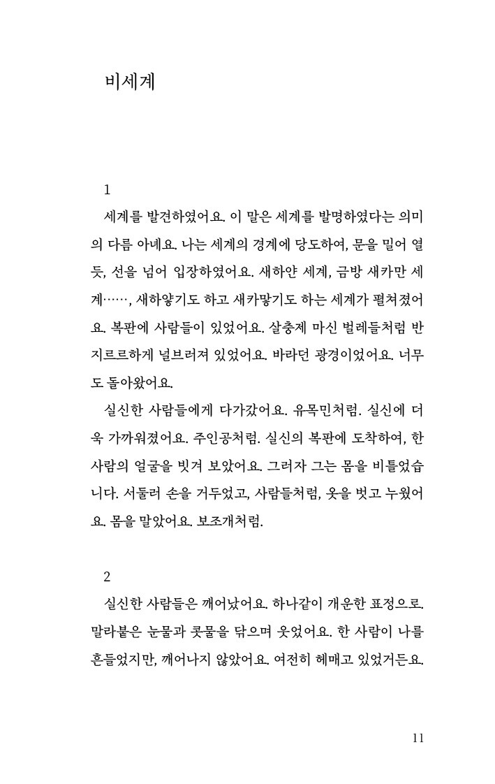 “나는 세계의 경계에 당도하여, 문을 밀어 열 듯, 선을 넘어 입장하였어요. 새하얀 세계, 금방 새카만 세계……, 새하얗기도 하고 새카맣기도 하는 세계가 펼쳐졌어요. 복판에 사람들이 있었어요. 살충제 마신 벌레들처럼 반지르르하게 널브러져 있었어요. 바라던 광경이었어요. 너무도 돌아왔어요.