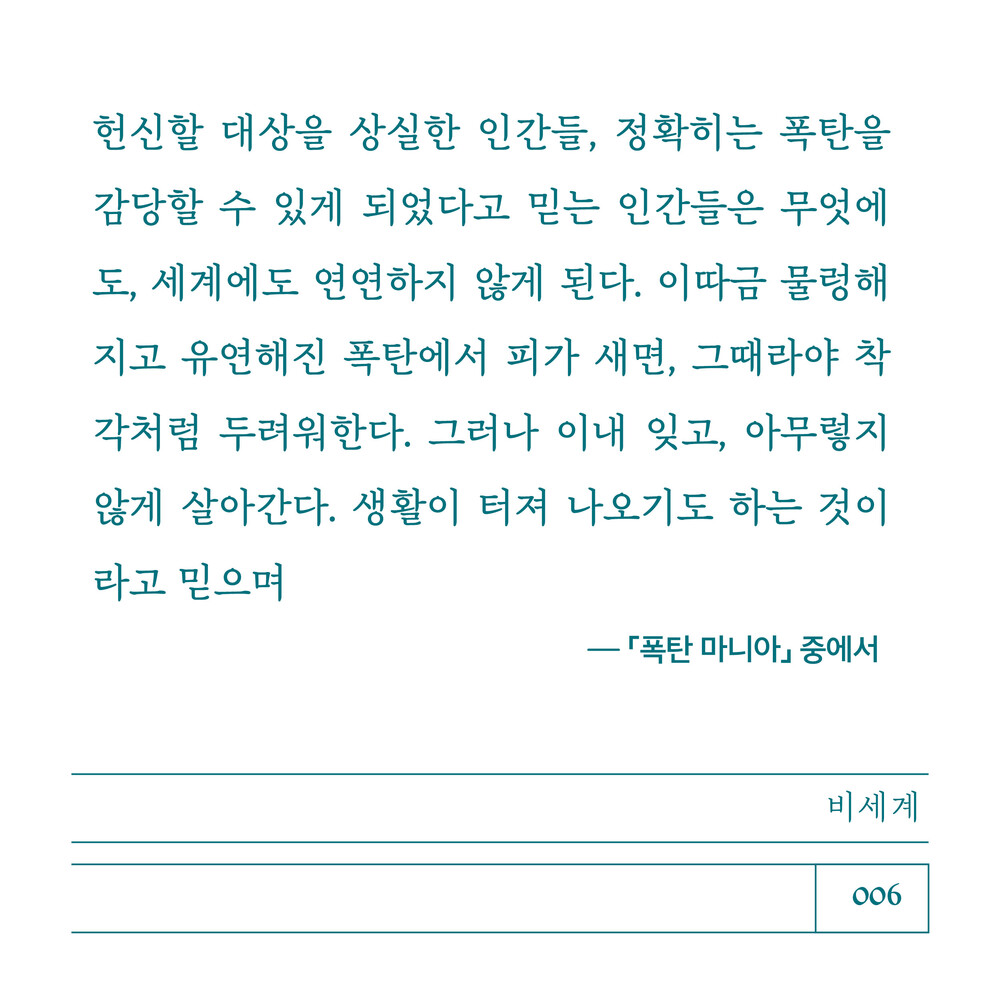 헌신할 대상을 상실한 인간들, 정확히는 폭탄을 감당할 수 있게 되었다고 믿는 인간들은 무엇에도, 세계에도 연연하지 않게 된다. 이따금 물렁해지고 유연해진 폭탄에서 피가 새면, 그때라야 착각처럼 두려워한다. 그러나 이내 잊고, 아무렇지 않게 살아간다. 생활이 터져 나오기도 하는 것이라고 믿으며