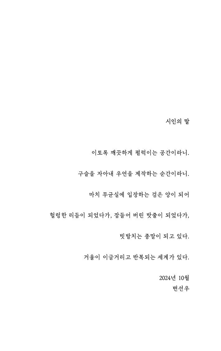 6년 전, 시인이 세상을 향해 처음 공개적으로 외쳤던 발화를 기억한다. 자신을 “기나긴 몸짓”이라고 명명했던 말. 몸짓들이 자유로이 운동하는 모습을 읽으면서, 시란 조직을 연결하는 유기성을 끝없이 해체하려는 갈망으로 구성되는 세계가 아닐까 생각했다. 시집을 읽으면 저항 없이 ‘기관 없는 신체’ 개념이 떠오른다. 시에 등장하는 거의 모든 것이 분절되는 감각으로 이루어진다. 자주 무너지는 세계들이 출현한다. 세계의 복수성은 숱한 연결과 해체를 “반복”하고 “번복”하는 감각일 것이다. 육체를 헤매는 시는 유기체를 의심하진 않는다. 다만 “이윽고 끊어지면서” 잠시 “독립”을 느낀다. 또 시인은 ‘버리다’라는 말을 보조 동사로 줄곧 사용한다. 사라지는 것이 아니라 사라져버리는 것이다. 깨지는 것이 아니라 깨져 버리는 것이다. 이처럼 시는 완전한 종료를 선언한다. 사실 우리는 이미 너무 많은 종료를 겹겹이 두르면서 생활한다. 오늘 하루도 완전히 끝나듯. 그리하여 이제 시인은 “비세계”와 “제정신세계” 사이를 가로지르며 우리를 향해 걸어온다. 사이가 통로라면 다행이지만 폭탄이라면 중간에 터져버릴 수도 있다. 그러나 변선우는 폭발을 두려워하지 않는다. 찢어져 버리는 감각으로 정확해지는 시인이다. 나는 이 시인을 오래 기다렸다. 복도 끝에서만 환해지는 빛 속에서. (이기리 시인)