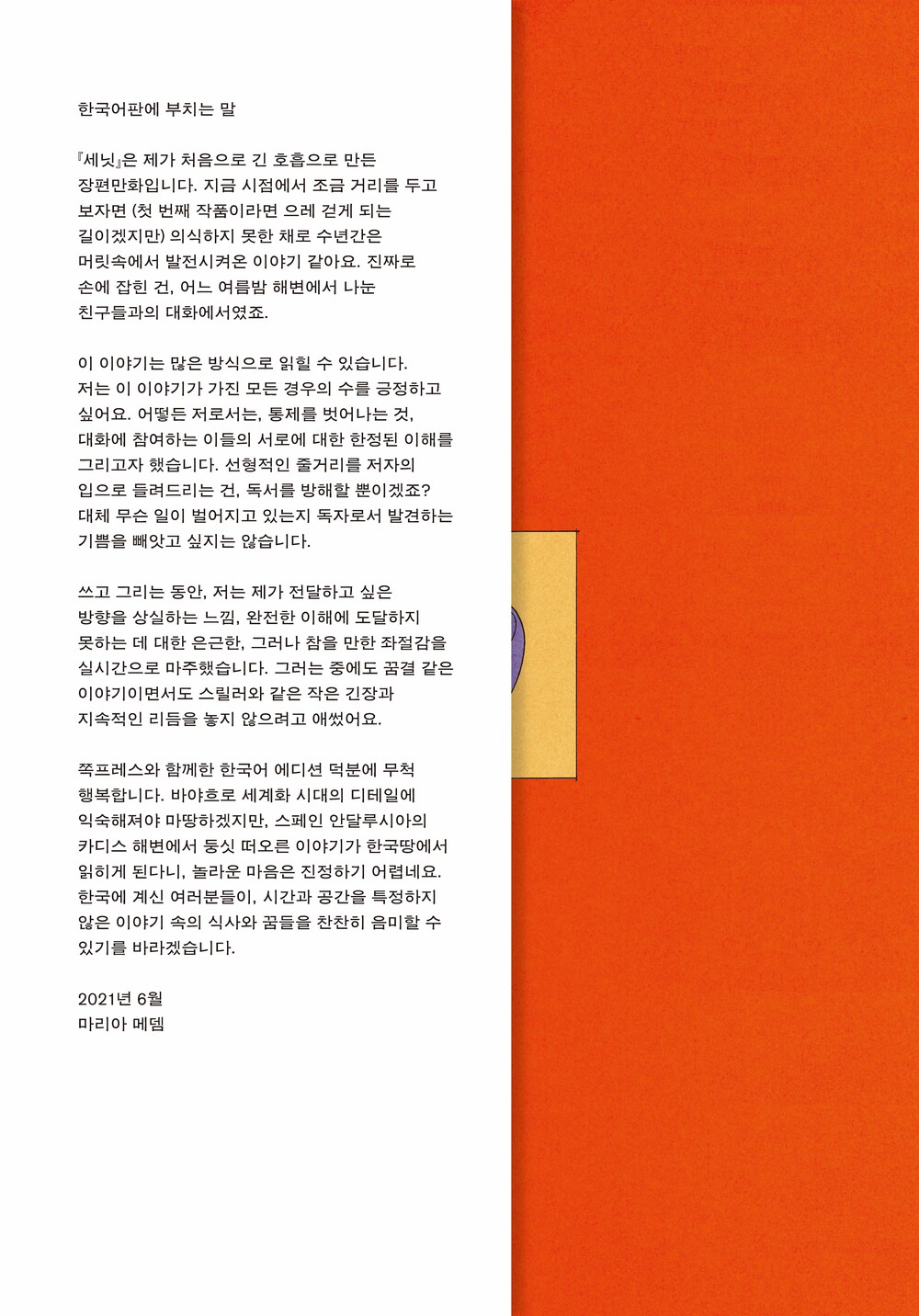 한국어판에 부치는 말 『세닛』은 제가 처음으로 긴 호흡으로 만든 장편만화입니다.