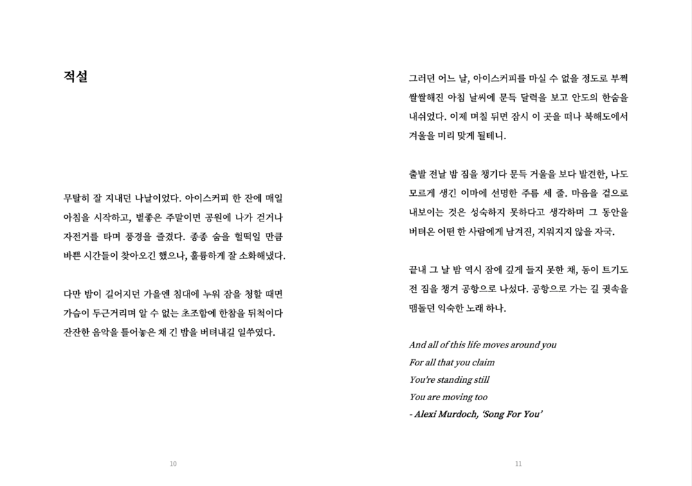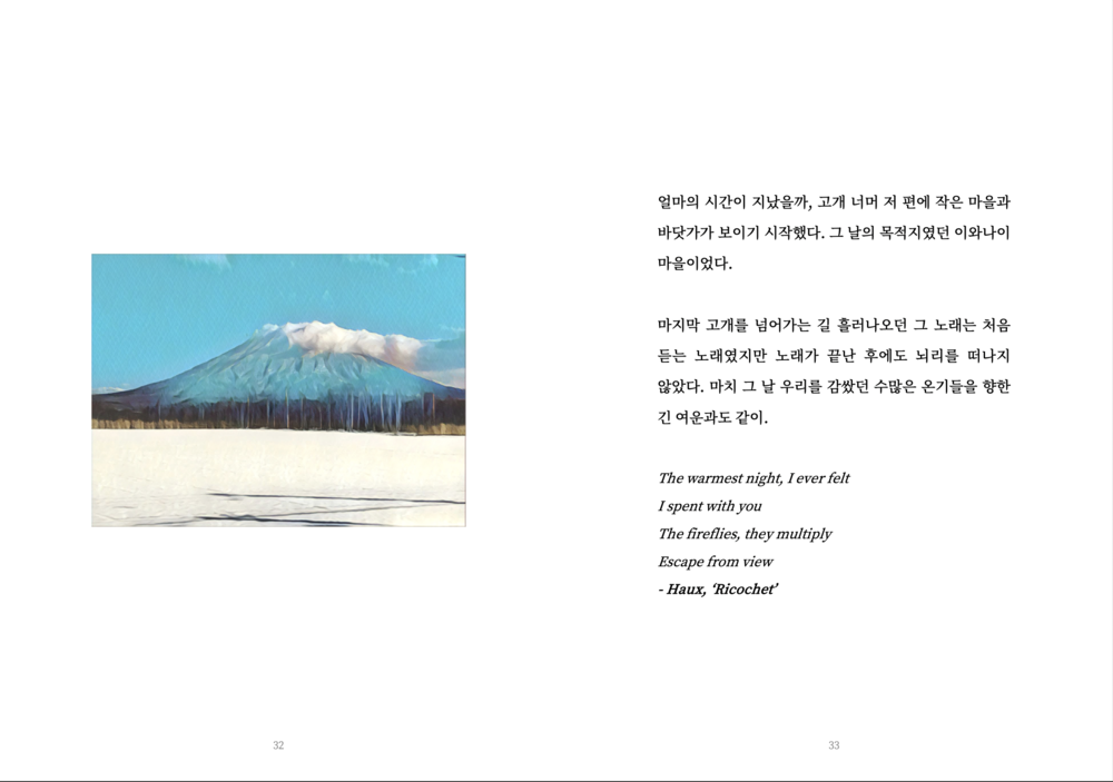 「마지막 고개를 넘어가는 길 흘러나오던 그 노래는 처음 듣는 노래였지만 노래가 끝난 후에도 뇌리를 떠나지 않았다. 마치 그 날 우리를 감쌌던 수많은 온기들을 향한 긴 여운과도 같이.」