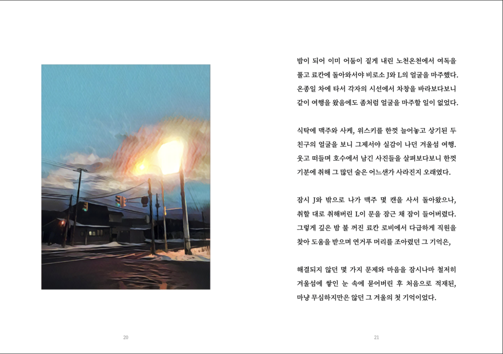 「해결되지 않던 몇 가지 문제와 마음을 잠시나마 철저히 겨울섬에 쌓인 눈 속에 묻어버린 후 처음으로 적재된, 마냥 무심하지만은 않던 그 겨울의 첫 기억이었다.」
