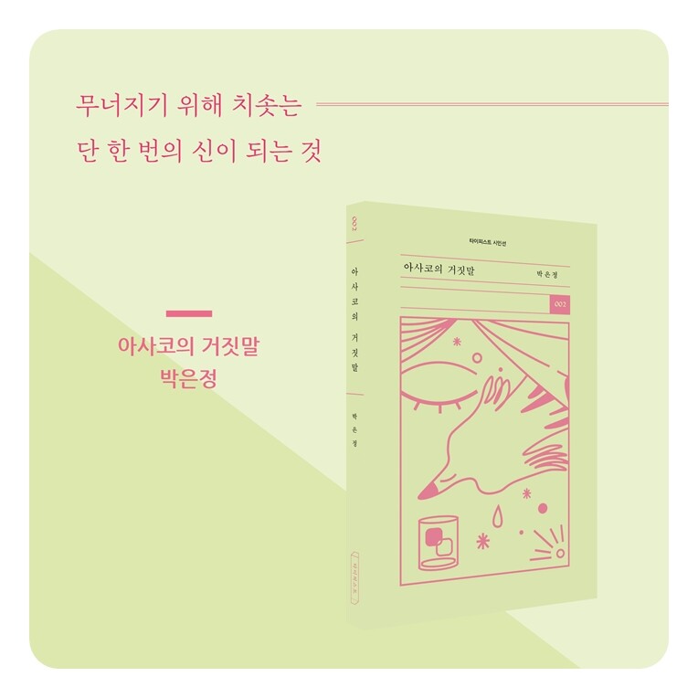 〈타이피스트 시인선〉002번으로 박은정 시인의 세 번째 시집 『아사코의 거짓말』이 출간되었다. 박은정 시인은 2011년 『시인세계』로 등단하여 시집 『아무도 모르게 어른이 되어』(문학동네, 2015) 『밤과 꿈의 뉘앙스』(민음사, 2020)를 펴냈으며 자신만의 목소리와 리듬으로 시적 세계를 구축해 왔다.