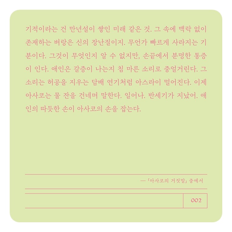 기적이라는 건 만년설이 쌓인 미래 같은 것. 그 속에 맥락 없이 존재하는 벼랑은 신의 장난질이지. 무언가 빠르게 사라지는 기분이다. 그것이 무엇인지 알 수 없지만, 손끝에서 분명한 통증이 인다. 애인은 갈증이 나는지 침 마른 소리로 중얼거린다. 그 소리는 허공을 지우는 담배 연기처럼 아스라이 멀어진다. 이제 아사코는 물 잔을 건네며 말한다. 일어나. 반세기가 지났어. 애인의 따듯한 손이 아사코의 손을 잡는다. -「아사코의 거짓말」 중에서