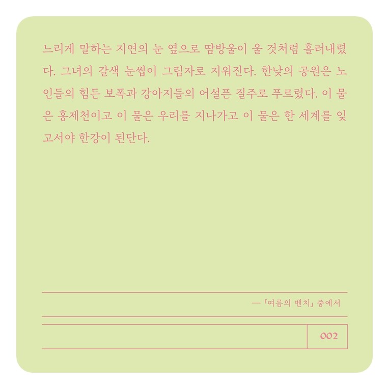느리게 말하는 지연의 눈 옆으로 땀방울이 울 것처럼 흘러내렸다. 그녀의 갈색 눈썹이 그림자로 지워진다. 한낮의 공원은 노인들의 힘든 보폭과 강아지들의 어설픈 질주로 푸르렀다. 이 물은 홍제천이고 이 물은 우리를 지나가고 이 물은 한 세계를 잊고서야 한강이 된단다. -「여름의 벤치」 중에서