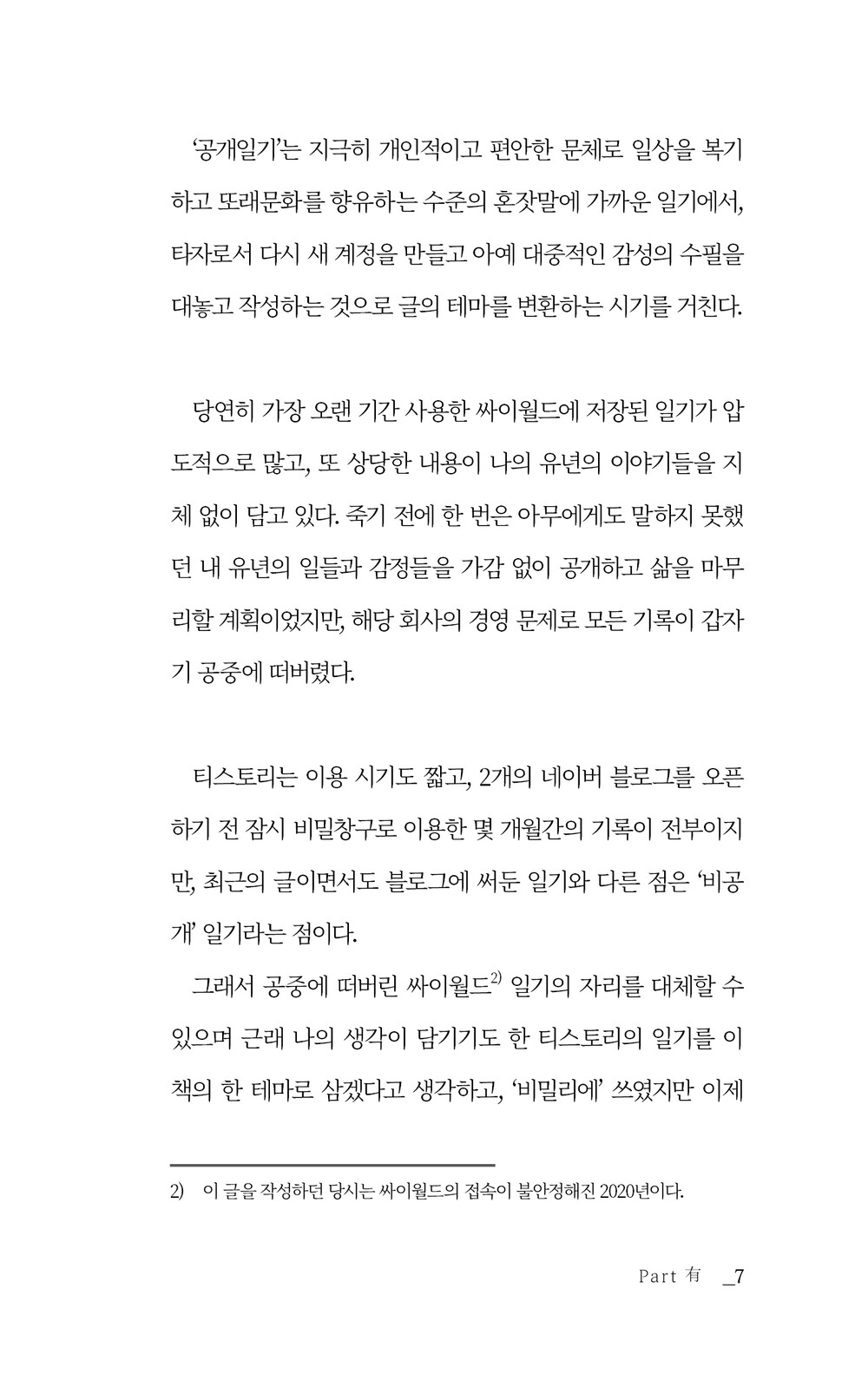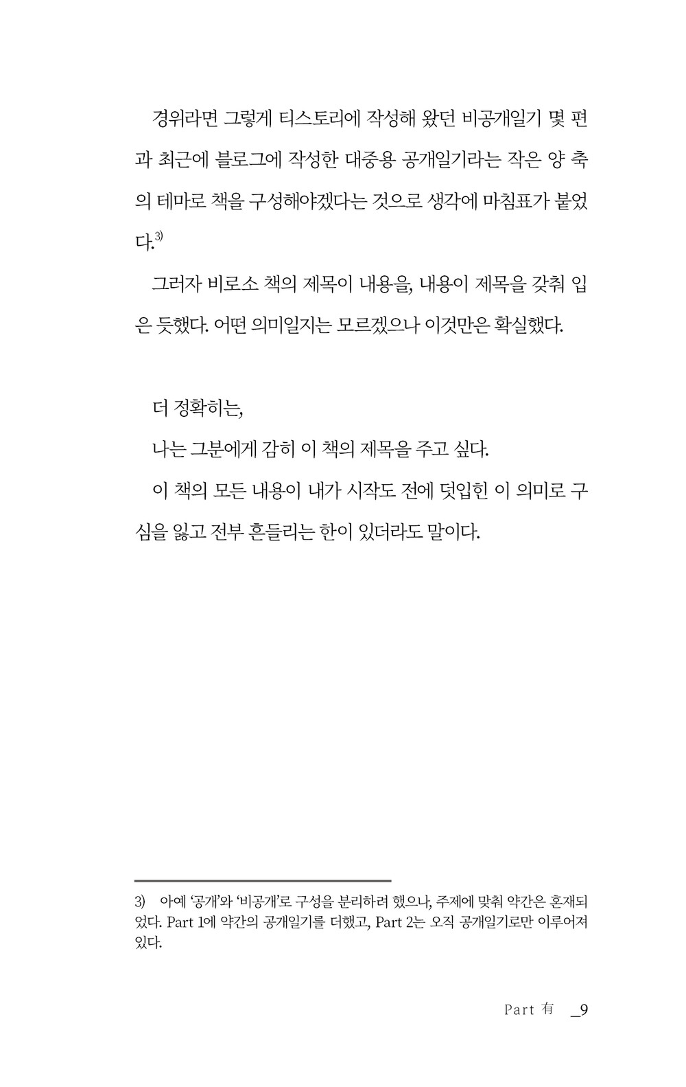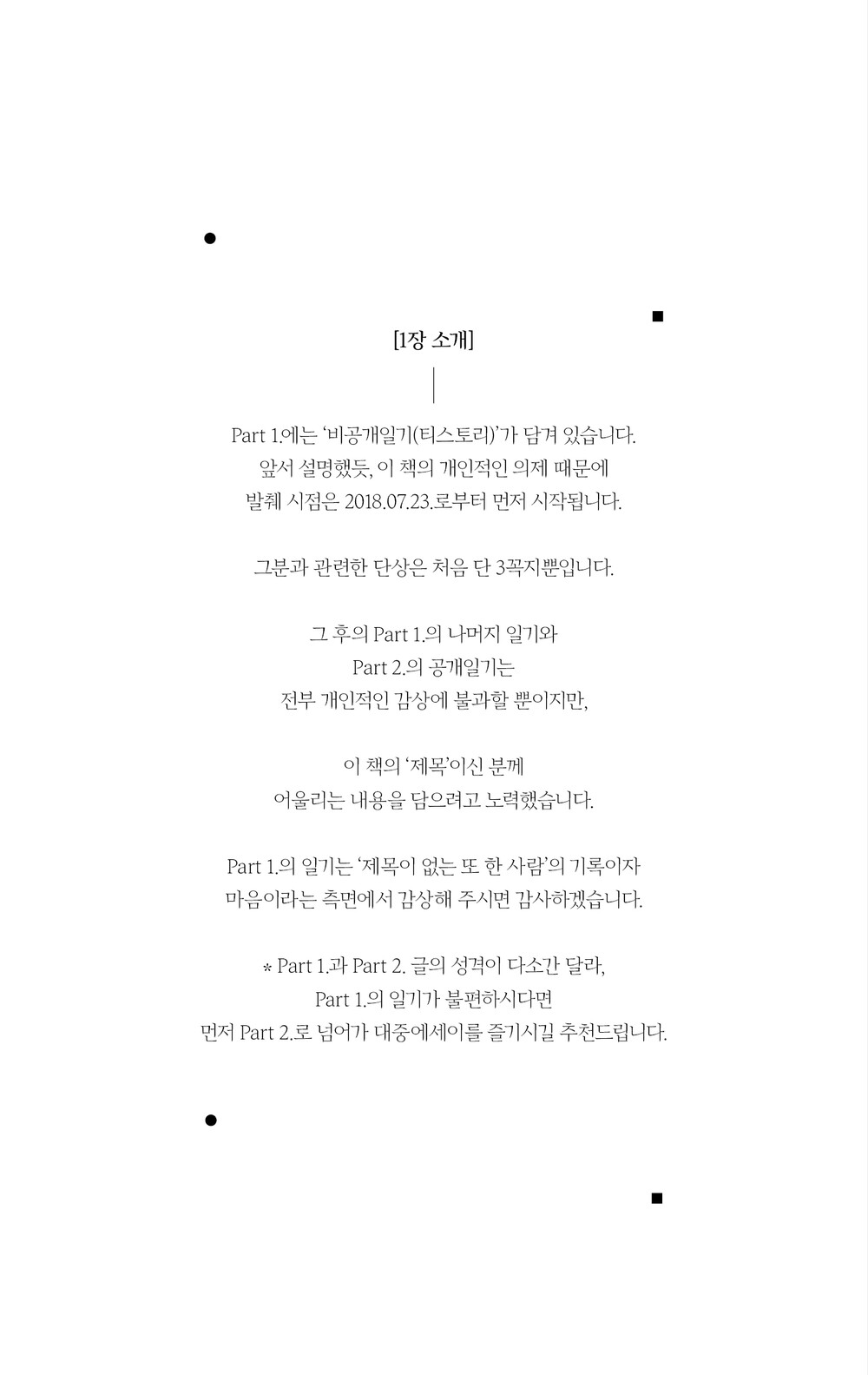 1, 2부로 나누어진 글은 개인적 일기와 대중적 에세이의 결합으로 구성되어 있습니다.