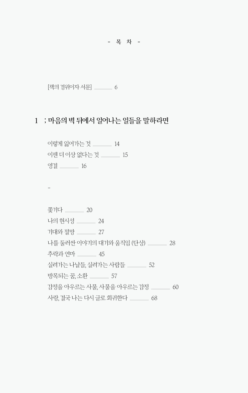 이 안에 수록된 글은 모두 사랑하는 줄, 사랑받는 줄 몰랐으나 뒤늦게 깨달은 이의 몸부림이기도 합니다.