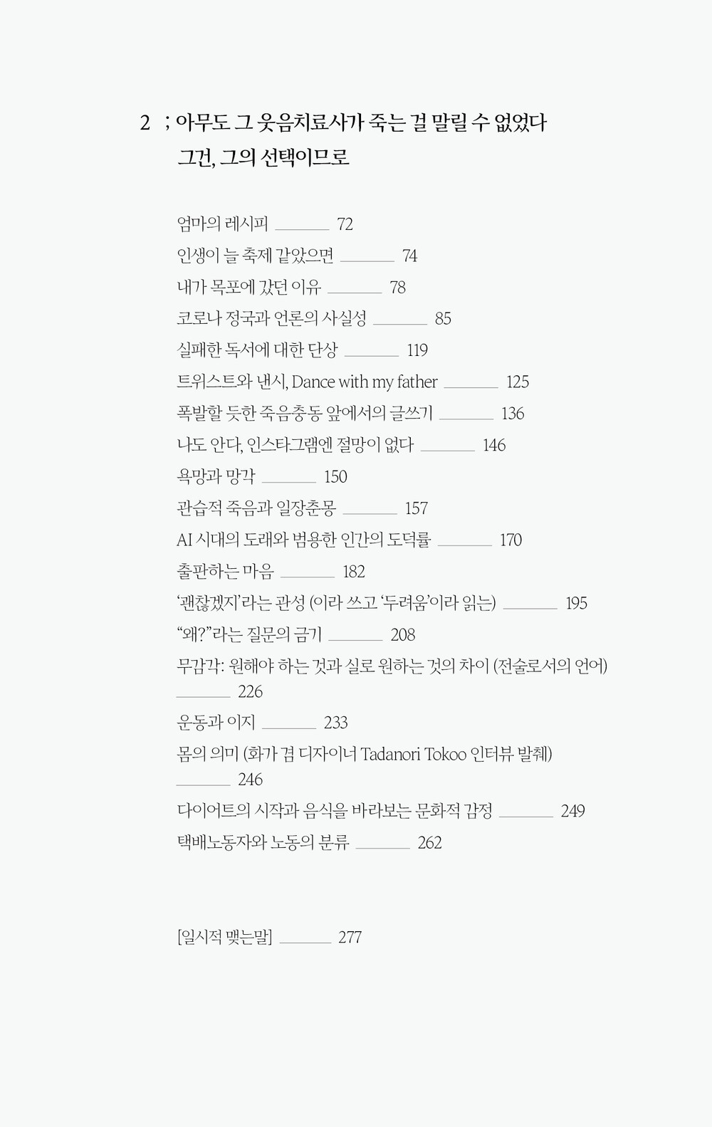 2부 ‘아무도 그 웃음치료사가 죽는 걸 말릴 수 없었다 그건, 그의 선택이므로’에는 19편의 에세이를 실었습니다.