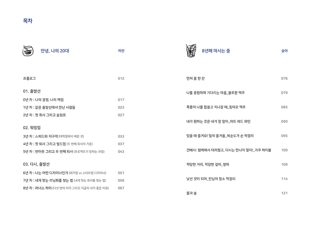 03.다시,출발선6년차:나는 어떤 디자이너인가 (대기업vs스타트업 디자이너)7년차: 내게 맞는 러닝화를 찾는 법 (내게 맞는 회사를 찾는 법)8년차: 러너스하이 (다섯 번의 이직 그리고 지금의 내가 좋은 이유)