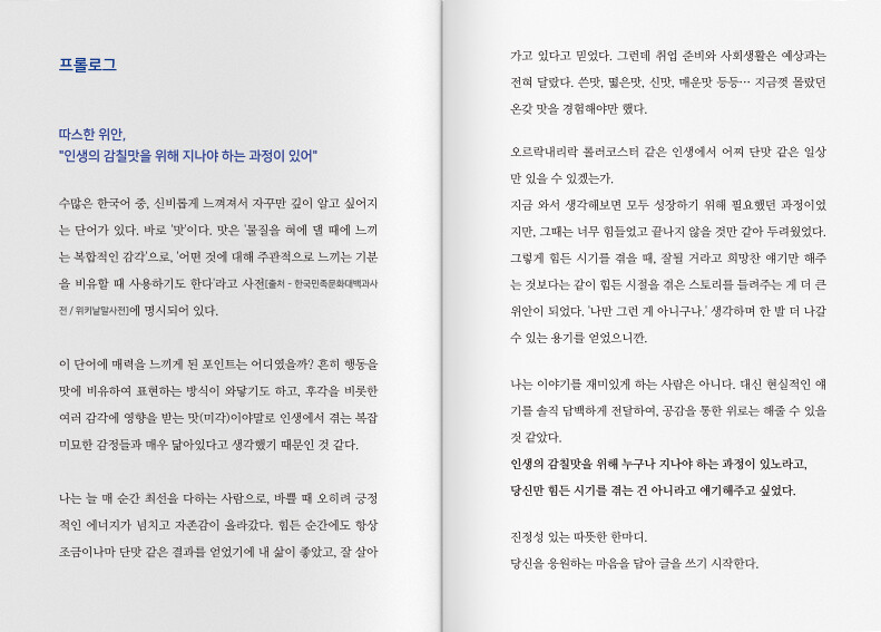 프롤로그따스한 위안,"인생의 감칠맛을 위해 지나야 하는 과정이 있어"