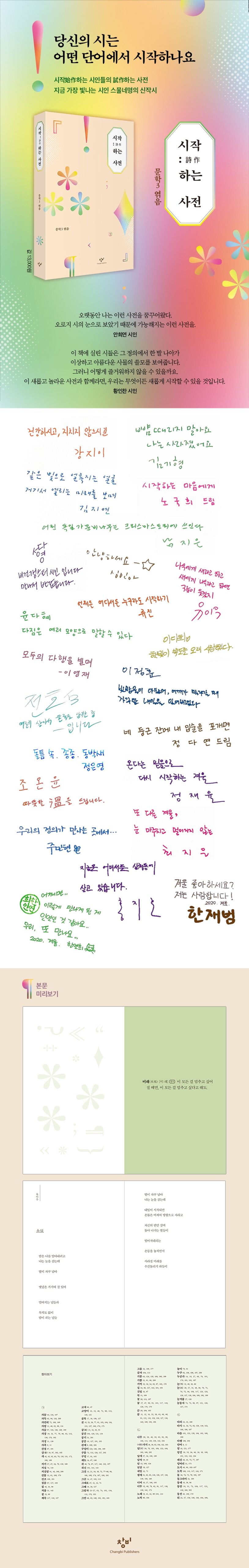 2019년 〔문학3〕 웹페이지에서 선보였던 시 연재 ‘시작하는 사전’이 단행본으로 출간되었다. 연재 당시 첫 시집을 내지 않은 신인 시인 스물네명이 신작시 두편과 함께 각 시의 키워드가 된 단어를 꼽고 그 단어를 시인만의 신선한 시각으로 다시 정의 내린 기획이다. 한권의 ‘사전’으로 연재를 다시 묶으며 단어를 중심으로 시를 읽을 수 있도록 했고, 단어 ‘찾아보기’와 새로운 형식의 ‘작가 소개’ 등 다른 읽을거리를 더한 독특한 콘셉트의 책이다. 갓 작품활동을 시작한 시인들이 모인 만큼 지금 가장 새로운 개성이 고스란히 담긴 한편, 수록 단어와 정의 역시 일상 속에 숨겨진 세계를 열어젖히며 또 한편의 시처럼 다가오는 매력으로 빛난다. “오로지 시의 눈으로 보았기 때문에 가능해지는 이런 사전”(발문, 안희연)을 통해 “우리는 무엇이든 새롭게 시작할 수 있을 것”(추천사, 황인찬)이다.