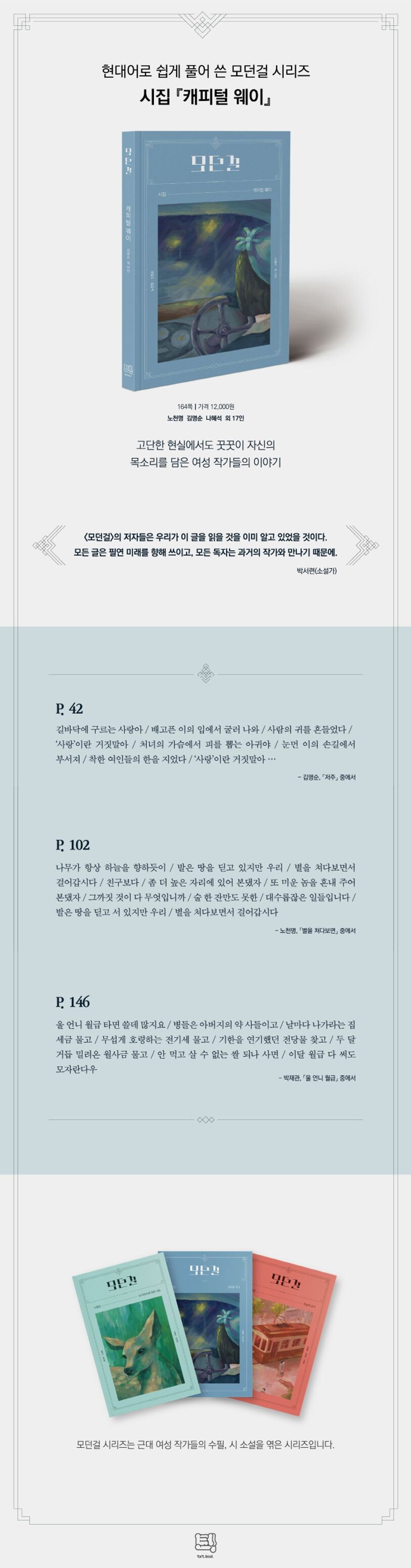〈모던걸 시리즈〉의 시집 『캐피털 웨이』는 비교적 유명한 작가뿐 아니라 당시 신문에 실렸던 무명의 일반인 여성들의 작품도 함께 실어 다양한 주제의 시를 감상할 수 있다. 이 책은 6부로 구성되어 있으며 총 80개의 시를 수록하고 있다. 1부 ‘그대이기에 서럽고 서러운 날들, 사랑은 괴롭고 슬프기만 한 것인가요’는 사랑의 설렘부터 이별의 아픔까지, 사랑하면서 여자가 겪는 보편적인 감정들을 다룬 시들로 구성하였다. 2부 ‘누군가 그의 손을 이끌었다, 그러나 그는 혼자였다’는 제목에서 알 수 있듯 여성이 주로 혼자일 때 느끼는 외로움과 고독을 담은 시로 구성하였다. 3부 ‘구름같이 왔다가는 뜻 모를 이 인생’은 인생의 덧없음이나 쓸쓸함, 그리움의 정조를 지닌 시들로 구성되어 있다. 4부 ‘꽃다운 꿈이 뒹구는 서리 내린 밤풍경’은 주로 노천명의 시들로, 그 중에서도 고즈넉한 시골 풍경을 묘사하는 시가 주를 이룬다. 5부 ‘발은 땅에 딛고 있지만 우리, 별을 쳐다보며 걸어갑시다’는 여성들에게 모던걸이 되자고 외치는 계몽적인 시들이다. 6부 ‘언니 다시 오실 때가 꽃 필때라기에’는 주로 가족에 대한 그리움과 애틋함을 담은 시다.