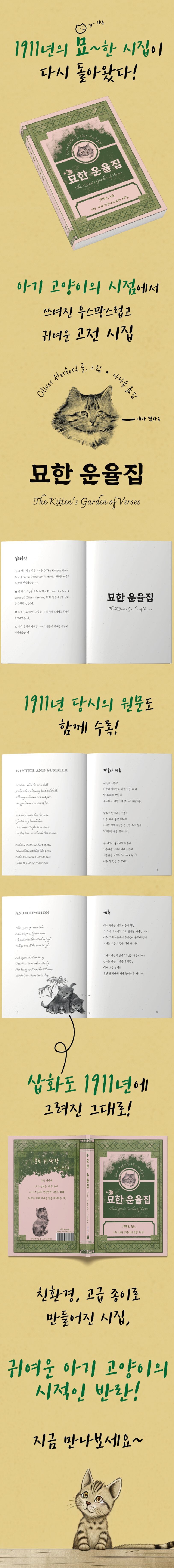 1911년도 미국에서 처음 나온 시집이 〈〈묘한 운율집〉〉으로 돌아왔어요. 〈〈묘한 운율집은〉〉 아기 고양이의 공상과 귀여운 생각들을 우스꽝스럽고 귀엽게 적어낸 시 모음집이에요. 원작자인 올리버 허포드는 미국의 시인으로 유명했는데요. 그의 위트 넘치는 시는 시대를 넘나드는 고전이 되었지요. 그러나 고전 시집인데도 불구하고 오늘날의 깜찍, 발랄한 우리네 아기 고양이와 다를 게 없네요!