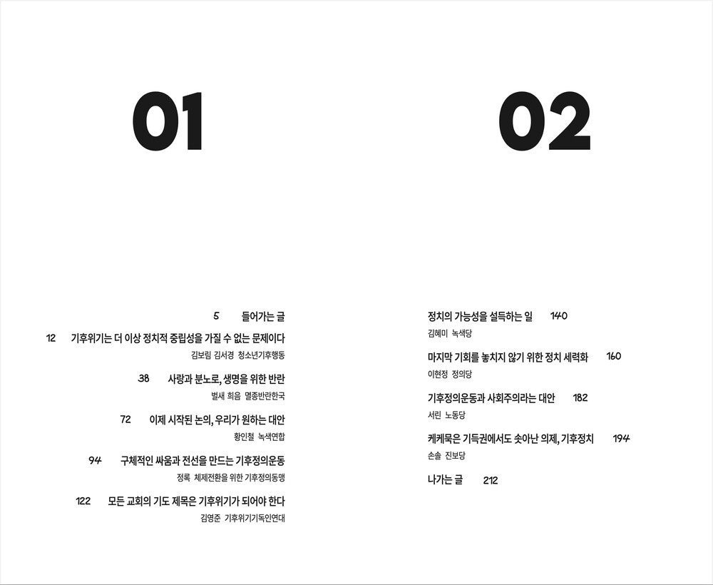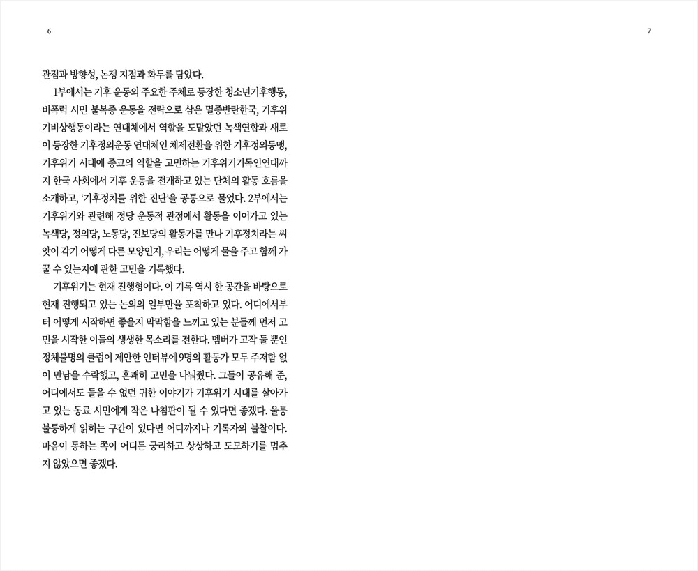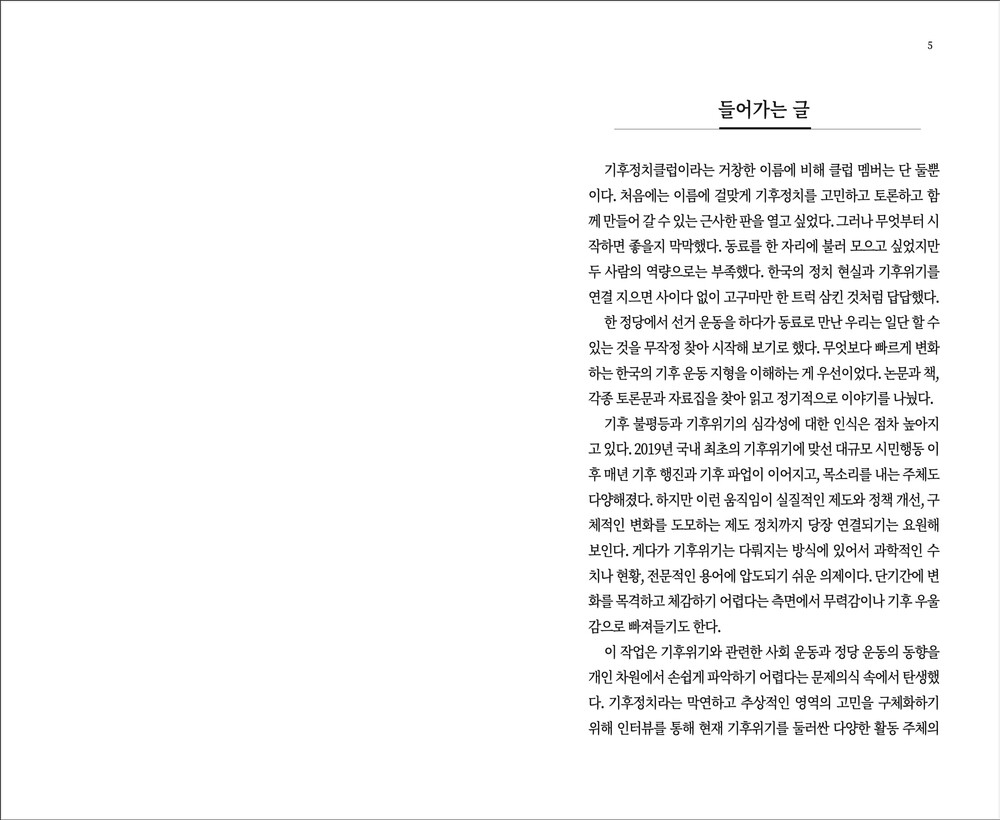 기후정치의 현장을 다루는 이 인터뷰집은 한국의 기후 운동 지형을 이해하고, 오늘보다 더 나은 기후정치를 고민하기 위해 기획되었다. 과학적 수치나 용어에 압도되거나, 무력감과 우울감에 빠지기 쉬운 기후위기라는 이슈를 사회 운동의 관점에서, 정당 운동의 영역에서 먼저 질문하고 궁리하고 활동해 온 아홉 편의 목소리를 기록했다. 이 책의 마지막 장을 넘긴 독자가 마음이 동하는 쪽 어디든 궁리하고 상상하고 도모하기를 멈추지 않길 바란다.