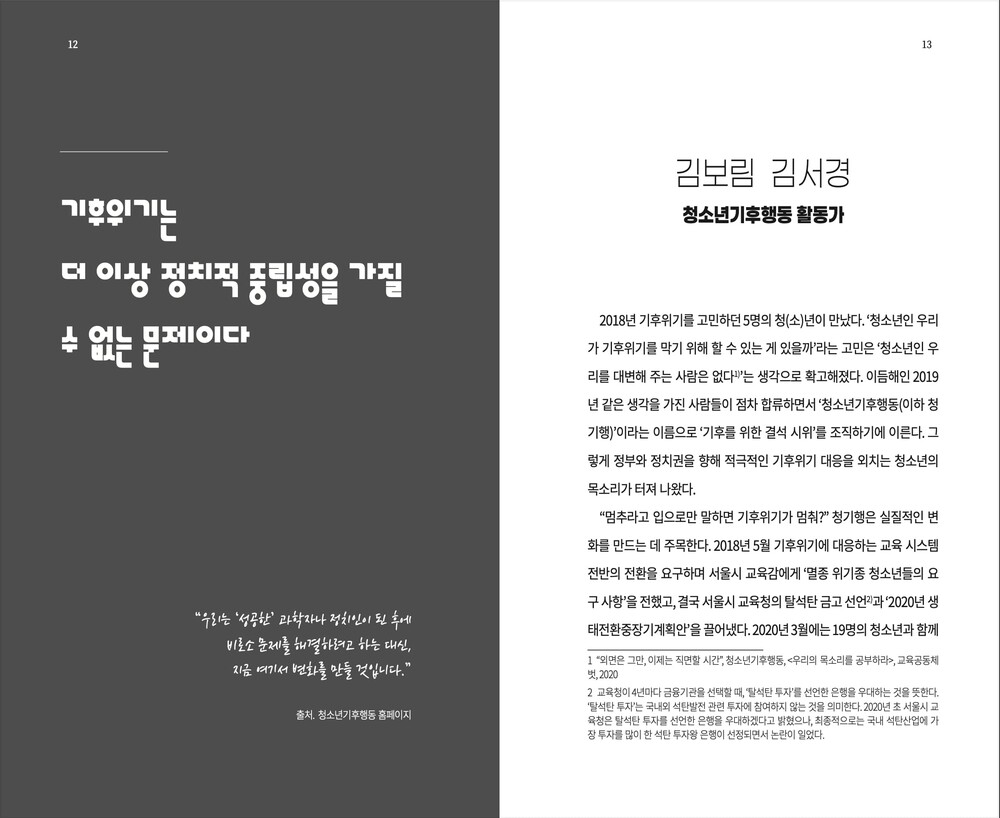 “아마 대부분의 사람이 기후위기를 진짜 심각하게 인식했을 때는 이미 늦었을 가능성이 크죠. 진짜로 우리가 뭔가 제대로 논쟁하고 싸우고 준비하지 않으면 정말 마지막 기회를 놓칠 수 있다고 생각해요.”