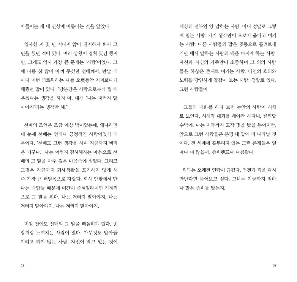 그때 나를 참 많이 아껴 주셨던 선배께서, 만날 때마다 매번 괴로워하는 나를 오랫동안 지켜보다 가 해줬던 말이 있다. “당분간은 사람으로부터 뭘 배우겠다 는 생각을 하지 마. 대신 ‘나는 저러지 말아야지’라는 생각만 해.”