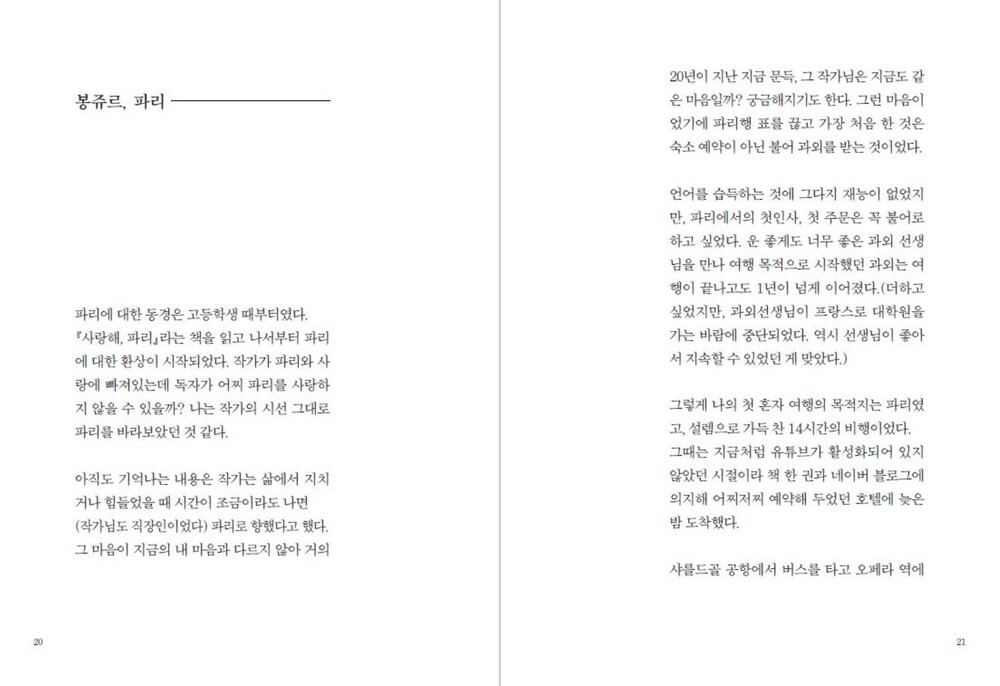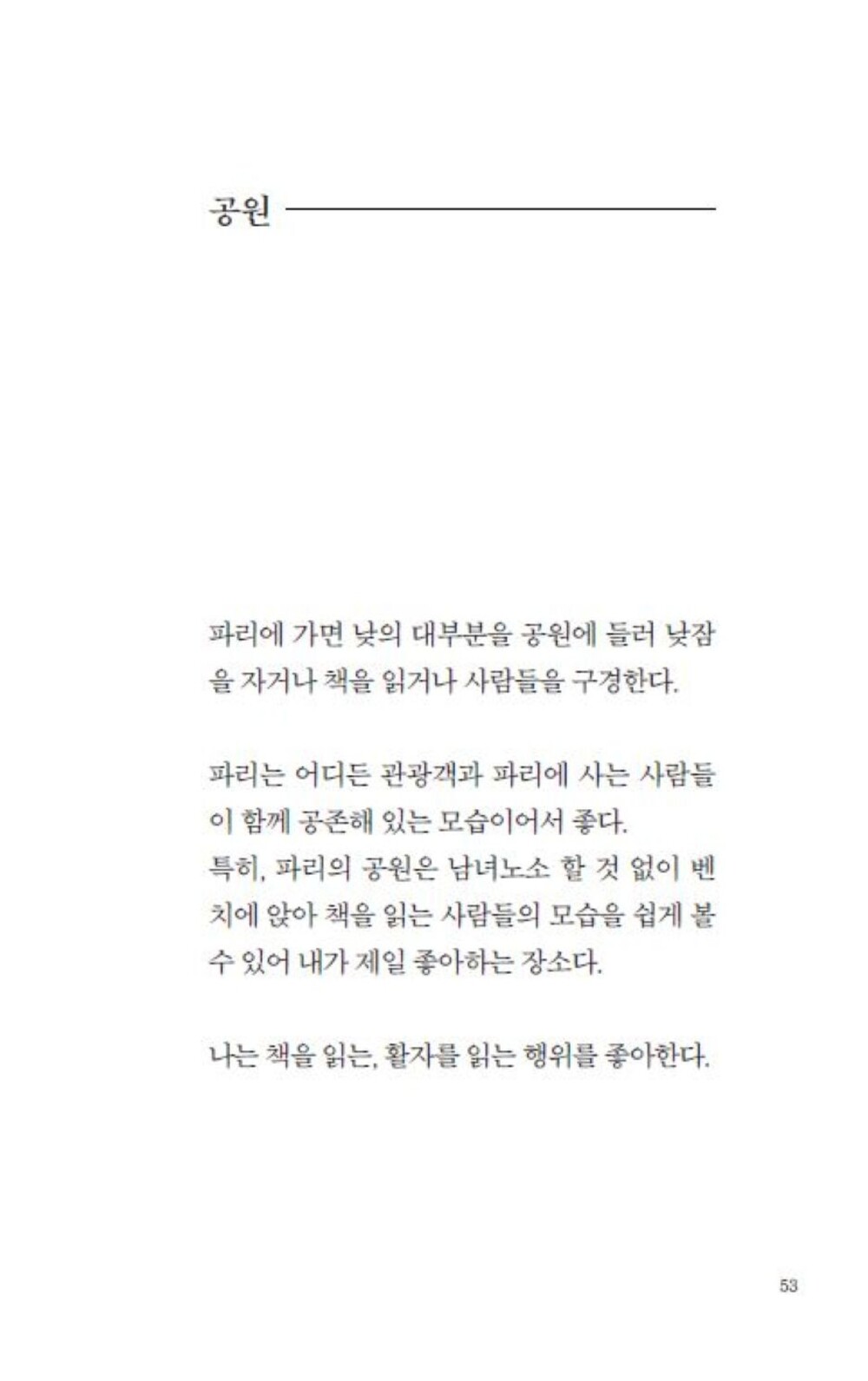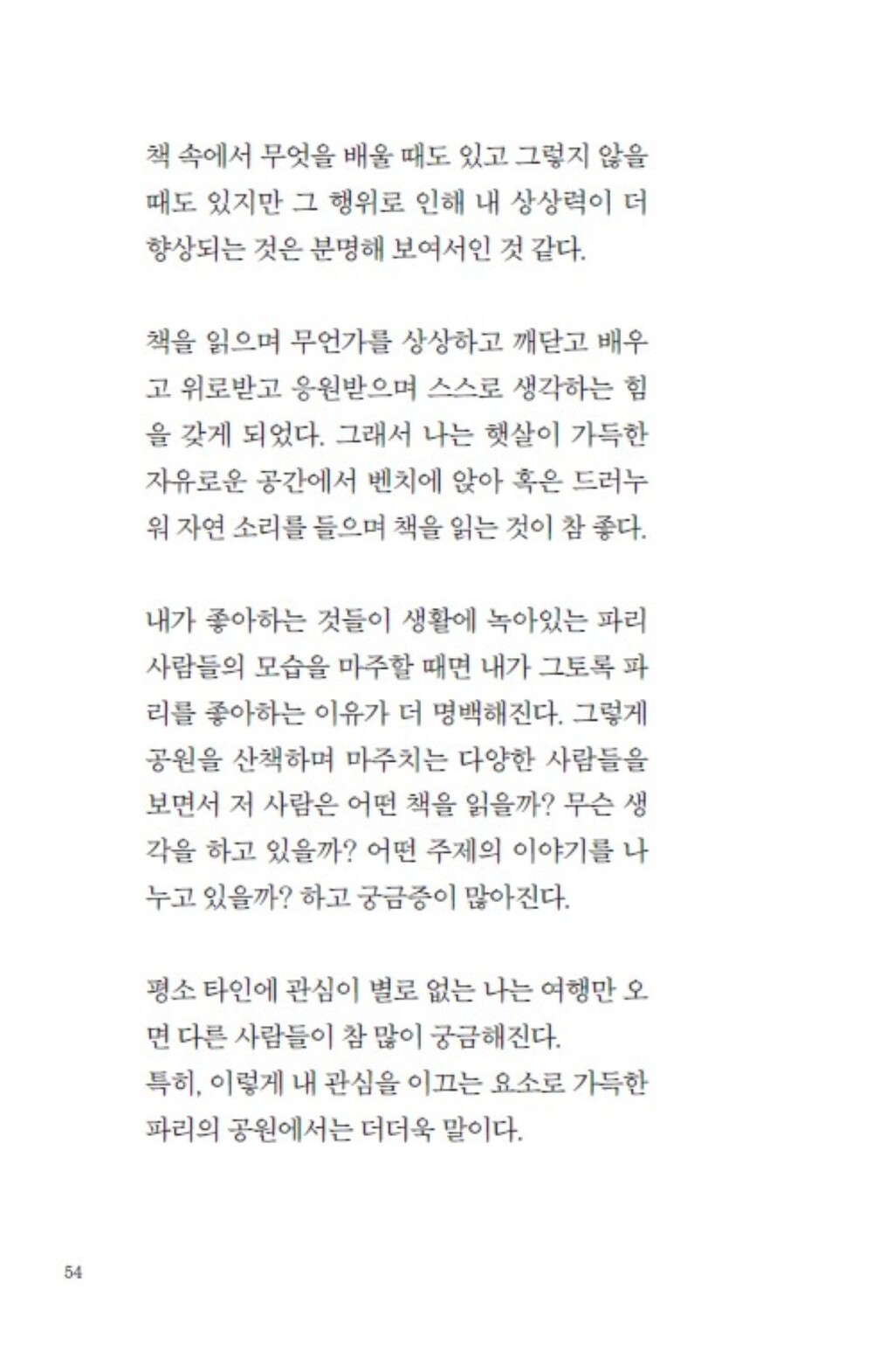 내가 좋아하는 것들이 생활에 녹아있는 파리 사람들의 모습을 마주할 때면 내가 그토록 파리를 좋아하는 이유가 더 명백해진다. 그렇게 공원을 산책하며 마주치는 다양한 사람들을 보면서 저 사람은 어떤 책을 읽을까? 무슨 생각을 하고 있을까? 어떤 주제의 이야기를 나누고 있을까? 하고 궁금증이 많아진다. <공원_p.54>