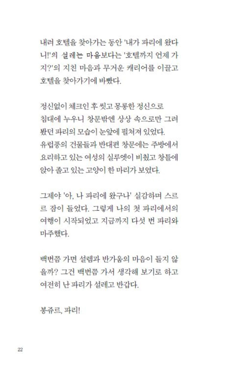치열하게 부딪쳐보고 내가 할 수 있는 것과 할 수 없는 것, 버텨낼 수 있는 것, 극복할 수 없는 것, 그럼에도 해낼 수 있는 것들이 무엇인지 판단할 수 있다는 건 내가 진짜 누구인지 알아가는 아주 가치 있는 시간일 테니까.내가 가장 나다워질 때는 매번 파리에서였다. <나다움_p.120>