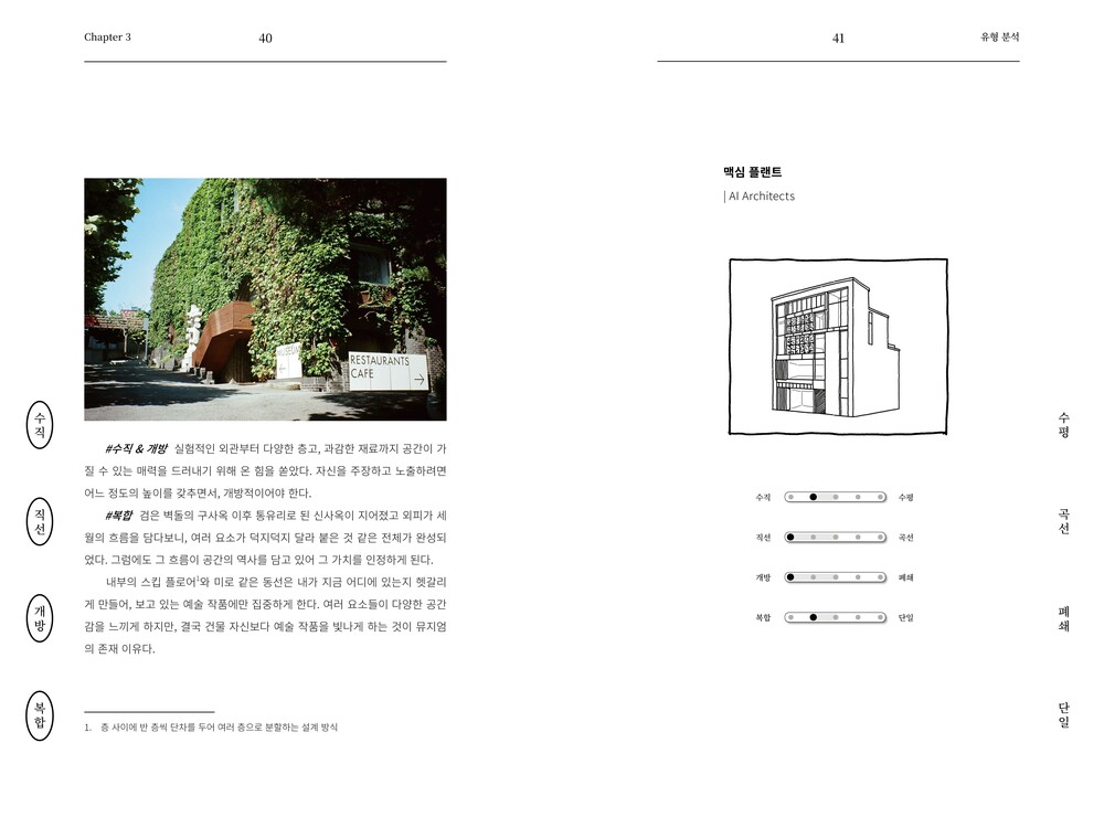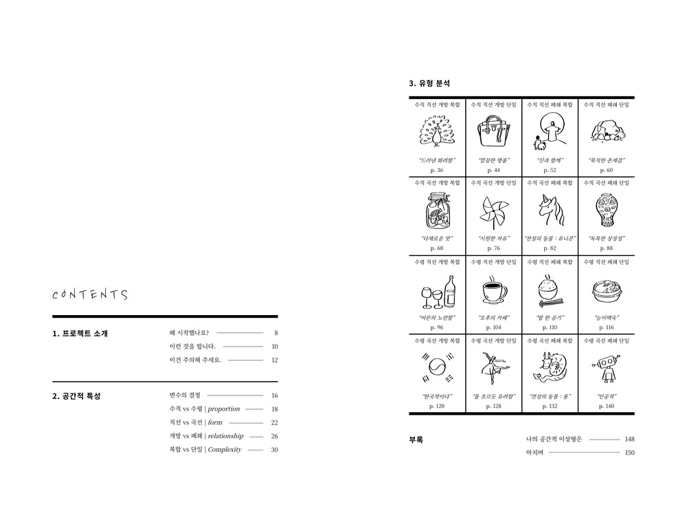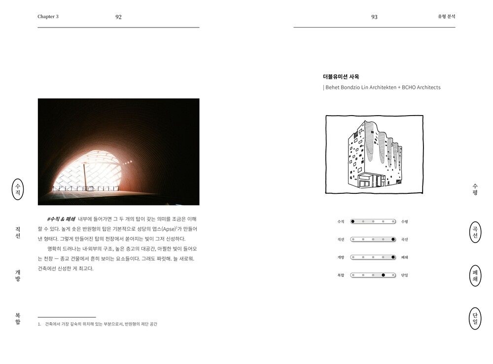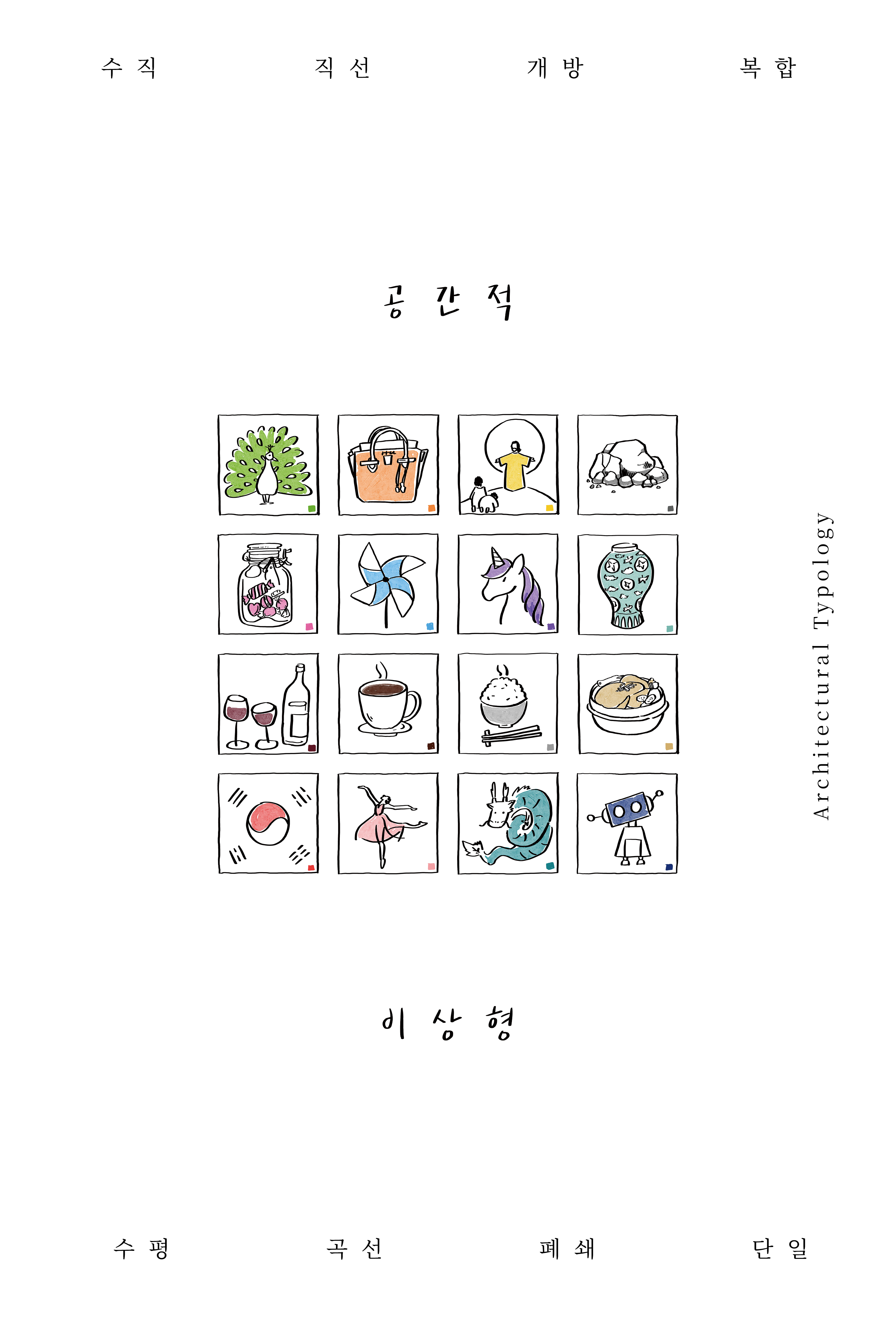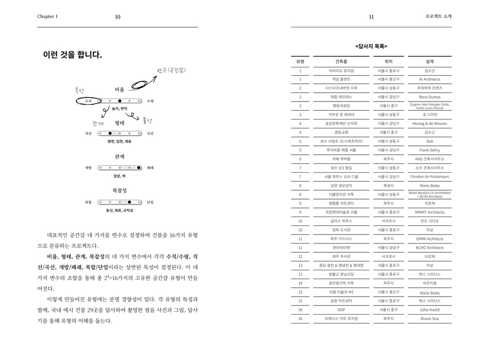 <공간적 이상형>은 우리가 공간에서 느끼는 감정인 '공간감'에 따라 건물을 16가지 유형으로 나누어 분류하고,