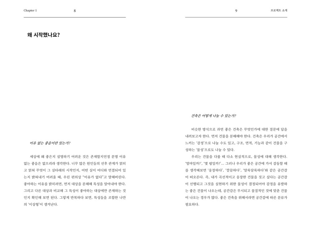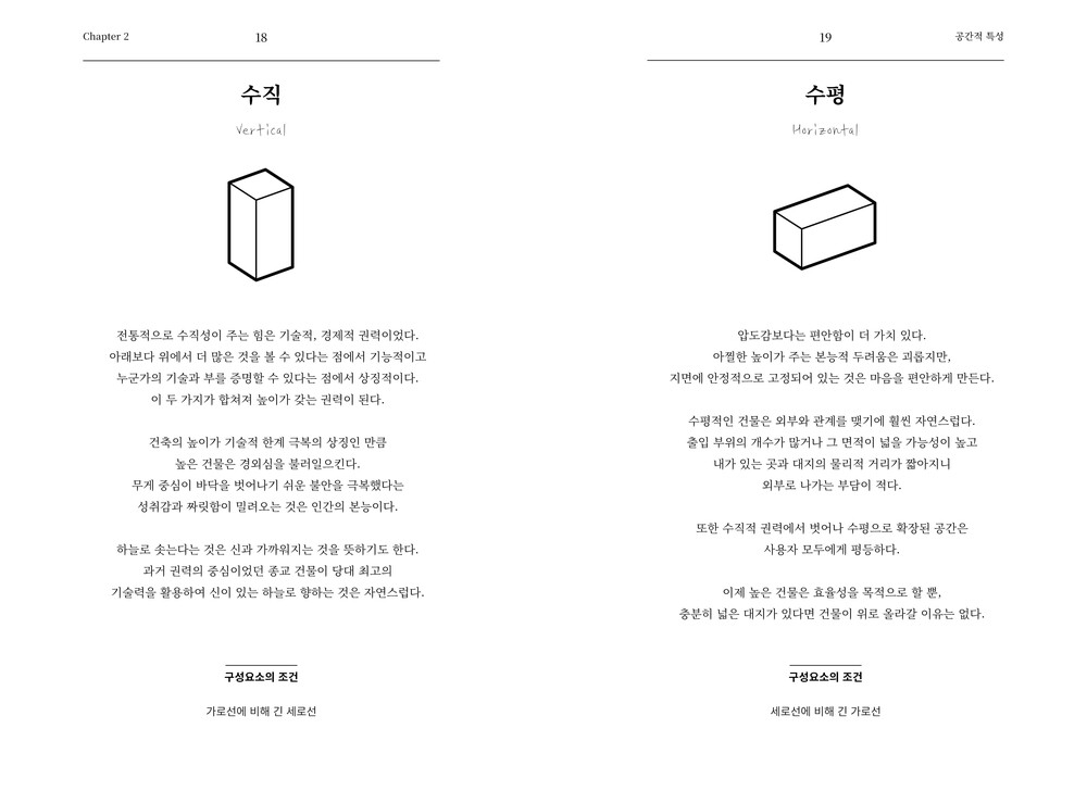건축은 우리가 공간에서 느끼는 ‘감정’으로 나눌 수도 있고, 구조, 면적, 기능과 같이 건물을 구 성하는 ‘물성’으로도 나눌 수 있다.