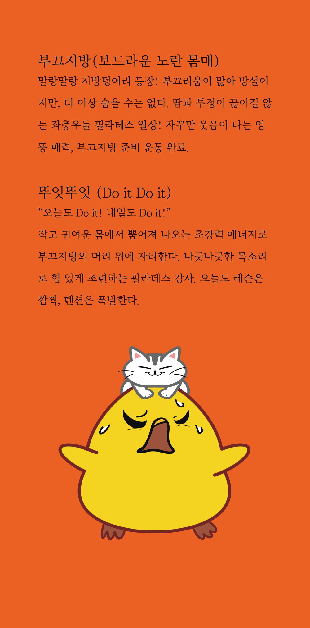 1.메인 캐릭터 : 운동 책은 왜 매번 매끄러운 몸매의 사람들일까요? 빌어먹을 필라테스의 표지는 운동이 필요한 일반인을 형성화한 통통하고 말랑한 병아리의 모습입니다.