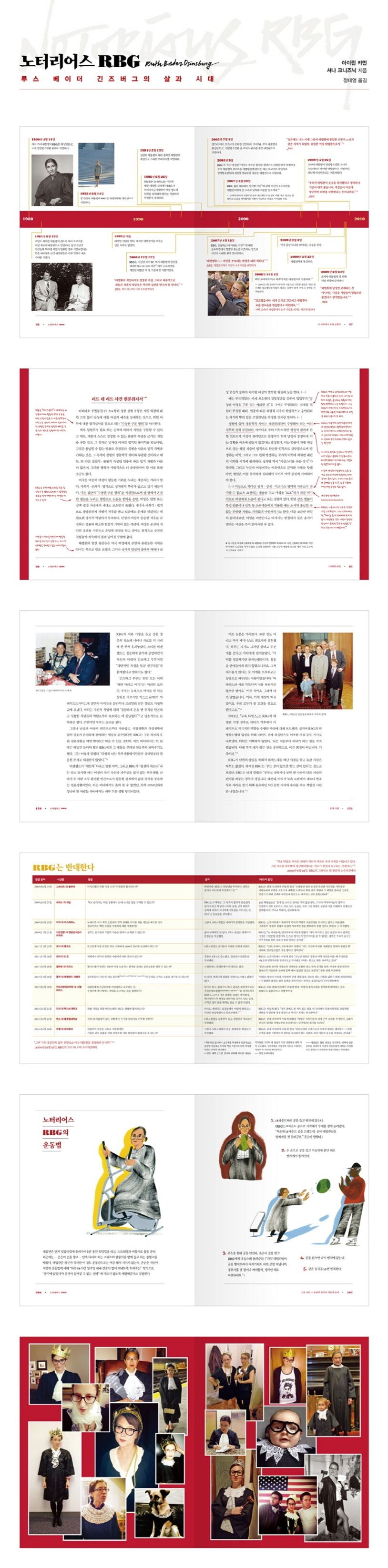 이 책을 쓴 두 저자는 한 훌륭한 개인의 공적 자아와 사회적 성취만을 다루는 데 그치지 않고, 그것을 지탱해주는 그 주변의 다른 훌륭한 개인들과 그 자신의 매력적인 사적 자아, 취미와 취향, 생활방식까지 경쾌하게 소개한다. 대통령 연두교서 때 꾸벅꾸벅 조는 모습, 집무실에서 터번을 쓰고 나타나 재판연구원들이 웃음을 참느라 곤욕을 겪은 에피소드, 형편없는 요리 실력과 운전 감각 등 RBG를 단지 훌륭한 위인이 아닌, 어떤 특별한 ‘개인’으로 그려냈다.