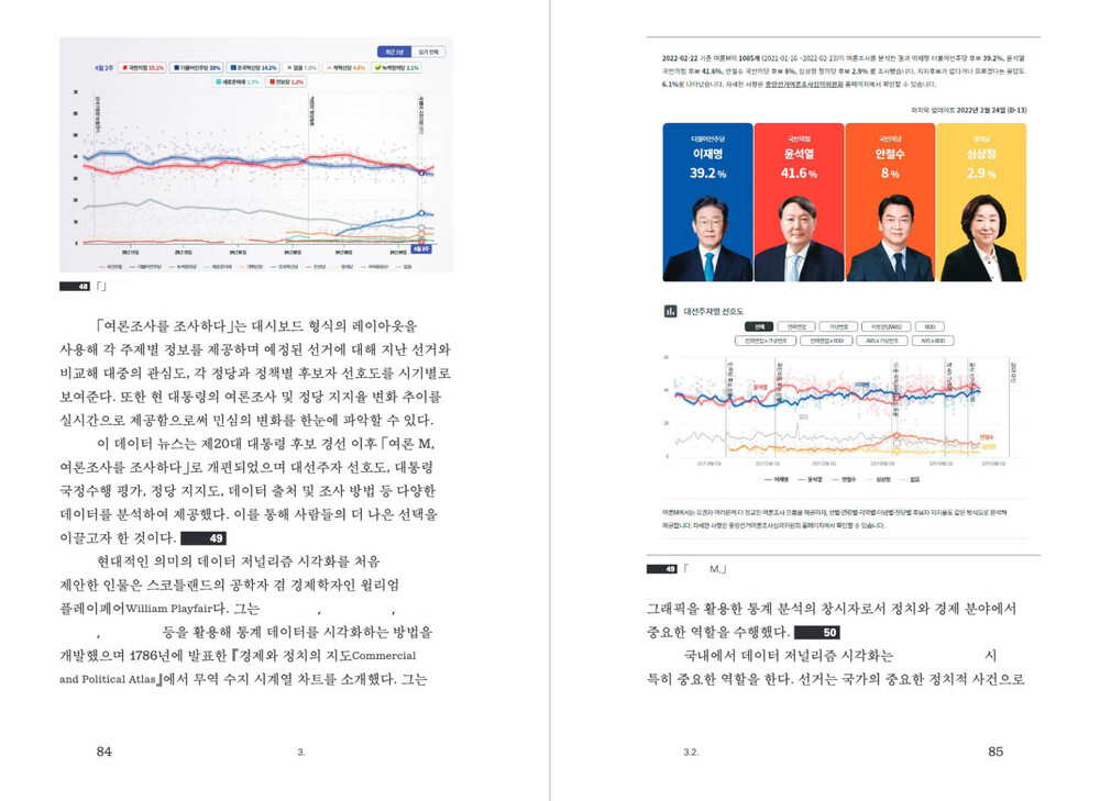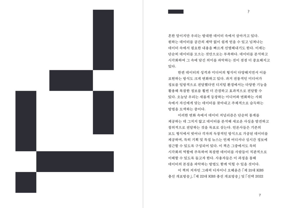 저자는 KBS와 MBC의 선거 방송 그래픽 디자인을 담당하며 쌓은 현장 경험과, 데이터 저널리즘 시각화에 대한 연구를 바탕으로 정보 디자인, 인포그래픽, 데이터 저널리즘의 차이를 명확히 짚어낸다. 여론조사, 선거방송, 참여형 데이터 뉴스 등 다양한 사례를 통해 데이터가 단순한 수치가 아닌 '이야기'로 읽히는 순간을 경험하게 한다.