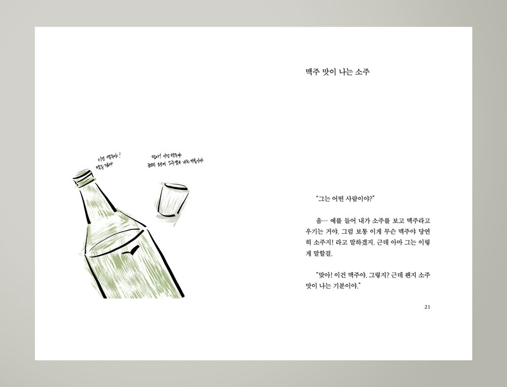 “맞아! 이건 맥주야. 그렇지? 근데 왠지 소주 맛이 나는 기분이야.”